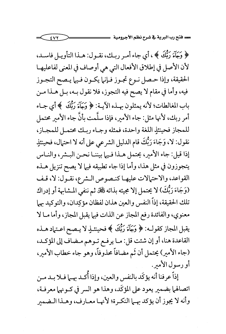 (وَجَاءَ رَبُّكَ)، أي جاء أمر ربك، نقول: هذا التأويل فاسد، لأن الأصل في إطلاق الأفعال التي هي أوصاف في المعنى لفاعليها الحقيقة، وإذا حصل نوع تجوز فإنما يكون فيما يصح التجوز فيه، وأما هذه الألفاظ نفسه وعينه في مقام لا يصح فيه التجوز، لا نقول به، وهذا من باب المغالطات؛ لأنه يمثلون بهذه الآية: (وَجَاءَ رَبُّكَ) أي جاء أمر ربك، لأنها مثل: جاء الأمير، فإذا سلَّمت بأنَّ جاء الأمير محتمل للمجاز فحينئذٍ اللغة واحدة، فمثله وجاء ربك محتمل للمجاز، نقول: لا، وَجَاءَ رَبُّكَ قام الدليل الشرعي على أنه لا احتمال، فحينئذٍ إذا قيل: جاء الأمير، يحتمل هذا فيما بيننا نحن البشر، والناس يتجوزون في مثل هذا، وأما إذا جاء تطبيقه فيما لا يصح تنزيل هذه القواعد، والاحتمالات عليها كنصوص الشرع، نقول: لا، قف (وَجَاءَ رَبُّكَ) لا يحتمل إلا مجيئه بذاته - عز وجل - ثم ننفي المشابهة أو إدراك تلك الحقيقة، إذاً النفس والعين هذان لفظان مؤكِدان، والتوكيد بهما معنوي، والفائدة رفع المجاز عن الذات فيما يقبل المجاز، وأما ما لا يقبل المجاز كقوله: (وَجَاءَ رَبُّكَ) فحينئذٍ لا يصح اعتماد هذه القاعدة في ذاك، أو إن شئت قل: ما يرفع توهم مضاف إلى المؤكد، (جاء الأمير) يحتمل أن ثَم مضافاً محذوفاً، وهو جاء خطاب الأمير، أو رسول الأمير.