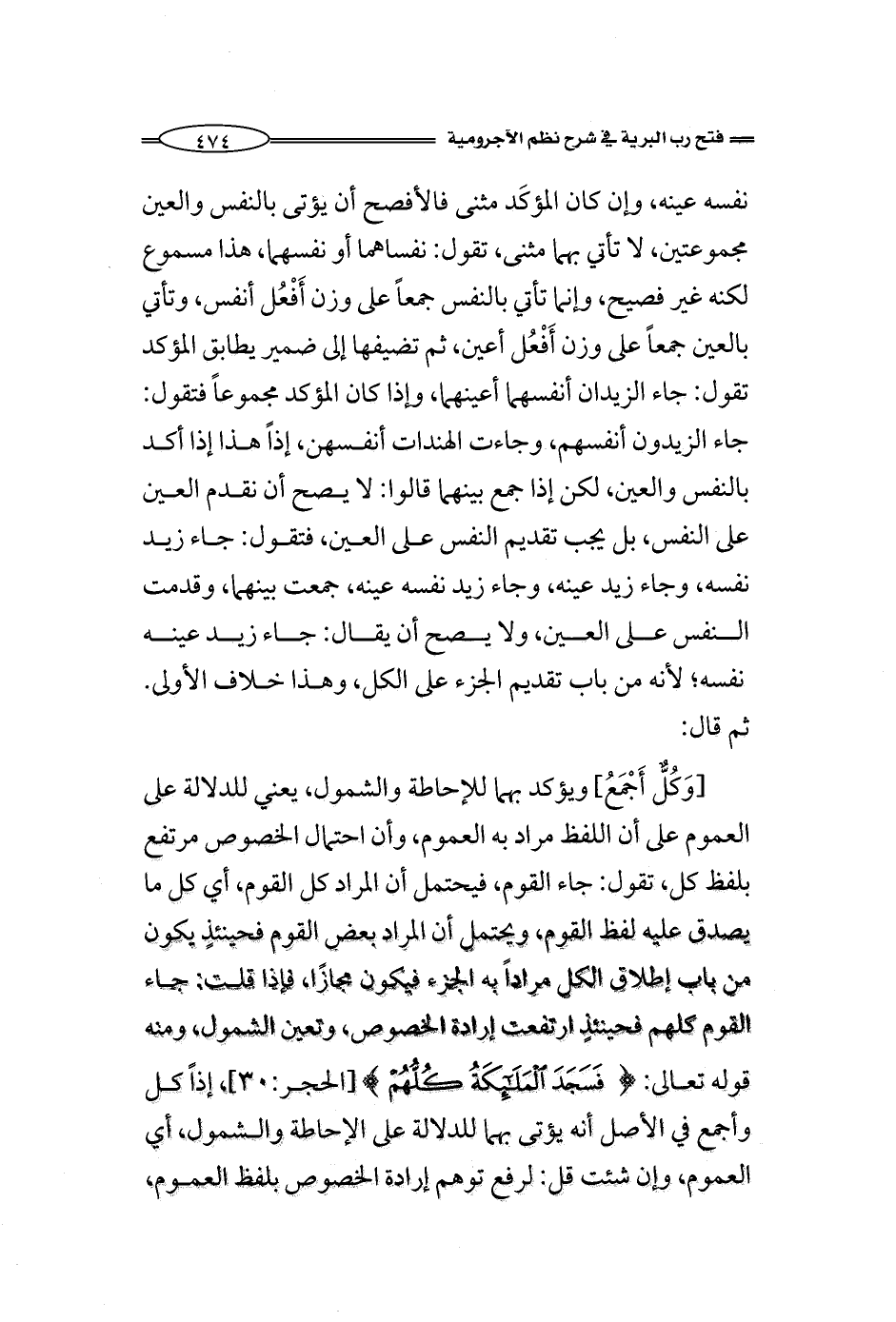 [وَكُلٌّ أَجْمَعُ] هذه كما ذكرنا يؤكد بهما للإحاطة والشمول، يعني للدلالة على العموم على أن اللفظ مراد به العموم، وأن احتمال الخصوص مرتفع بلفظ كل، تقول: جاء القوم، فيحتمل أن المراد كل القوم، أي كل ما يصدق عليه لفظ القوم، ويحتمل أن المراد بعض القوم فحينئذٍ يكون من باب إطلاق الكل مراداً به الجزء فيكون مجازًا، فإذا قلت: جاء القوم كلهم فحينئذٍ ارتفعت إرادة الخصوص، وتعين الشمول، ومنه قوله تعالى: (فَسَجَدَ الْمَلائِكَةُ كُلُّهُمْ) [الحجر:30]، إذاً كل وأجمع في الأصل أنه يؤتى بهما للدلالة على الإحاطة والشمول، أي العموم، وإن شئت قل: لرفع توهم إرادة الخصوص بلفظ العموم،