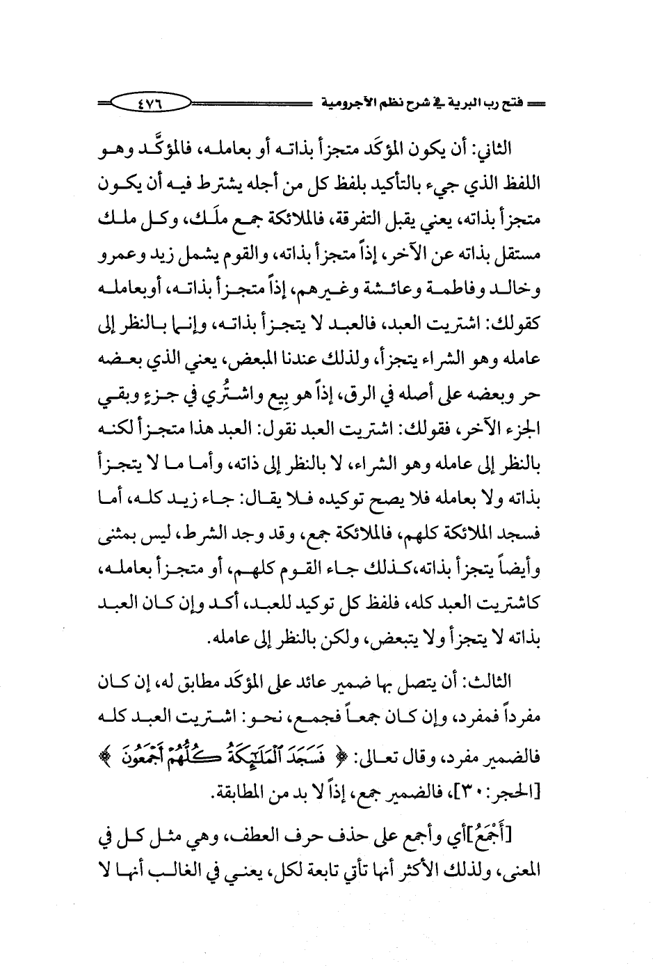 الثاني: أن يكون المؤكَد متجزأ بذاته أو بعامله، فالمؤكَّد وهو اللفظ الذي جيء بالتأكيد بلفظ كل من أجله يشترط فيه أن يكون متجزأ بذاته، يعني يقبل التفرقة، فالملائكة جمع ملَك، وكل ملك مستقل بذاته عن الآخر، إذاً متجزأ بذاته، والقوم يشمل زيد وعمرو وخالد وفاطمة وعائشة وغيرهم، إذاً متجزأ بذاته، أوبعامله كقولك: اشتريت العبد، فالعبد لا يتجزأ بذاته، وإنما بالنظر إلى عامله وهو الشراء يتجزأ، ولذلك عندنا المبعض، يعني الذي بعضه حر وبعضه على أصله في الرق، إذاً هو بِيع واشتُري في جزءٍ وبقي الجزء الآخر، فقولك: اشتريت العبد نقول: العبد هذا متجزأ لكنه بالنظر إلى عامله وهو الشراء، لا بالنظر إلى ذاته، وأما ما لا يتجزأ بذاته ولا بعامله فلا يصح توكيده فلا يقال: جاء زيد كله، أما فسجد الملائكة كلهم، فالملائكة جمع، وقد وجد الشرط، ليس بمثنى وأيضاً يتجزأ بذاته، كذلك جاء القوم كلهم، أو متجزأ بعامله، كاشتريت العبد كله، فلفظ كل توكيد للعبد، أكد وإن كان العبد بذاته لا يتجزأ ولا يتبعض، ولكن بالنظر إلى عامله.