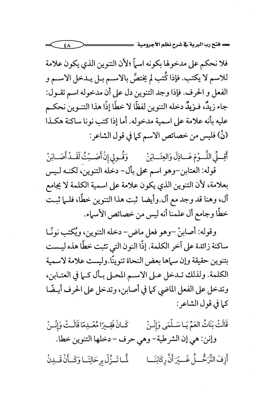 وقوله: أصابنْ -وهو فعل ماض- دخله التنوين، ويُكتب نونا ساكنة زائدة على آخر الكلمة. إذًا النون التي تثبت خطًا هذه ليست بتنوين حقيقة وإن سماها بعض النحاة تنوينا. وليست علامة لاسمية الكلمة. ولذلك تدخل على الاسم المحلى بأل كما في العتابن، وتدخل على الفعل الماضي كما في أصابن، وتدخل على الحرف أيضًا كما في قول الشاعر: