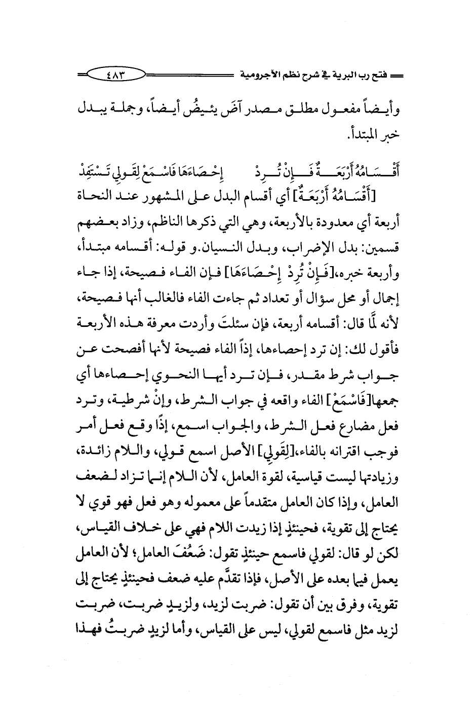 [أَقْسَامُهُ أَرْبَعَةٌ] أي أقسام البدل على المشهور عند النحاة أربعة أي معدودة بالأربعة، وهي التي ذكرها الناظم، وزاد بعضهم قسمين: بدل الإضراب، وبدل النسيان. وقوله: أقسامه مبتدأ، وأربعة خبره، [فَإِنْ تُرِدْ إِحْصَاءَهَا] فإن الفاء فصيحة، إذا جاء إجمال أو محل سؤال أو تعداد ثم جاءت الفاء فالغالب أنها فصيحة، لأنه لَمَّا قال: أقسامه أربعة، فإن سئلتَ وأردت معرفة هذه الأربعة فأقول لك: إن ترد إحصاءها، إذاً الفاء فصيحة لأنها أفصحت عن جواب شرط مقدر، فإن ترد أيها النحوي إحصاءها أي جمعها [فَاسْمَعْ] الفاء واقعه في جواب الشرط، وإنْ شرطية، وترد فعل مضارع فعل الشرط، والجواب اسمع، إذًا وقع فعل أمر فوجب اقترانه بالفاء، [لِقَولِي] الأصل اسمع قولي، واللام زائدة، وزيادتها ليست قياسية، لقوة العامل، لأن اللام إنما تزاد لضعف العامل، وإذا كان العامل متقدماً على معموله وهو فعل فهو قوي لا يحتاج إلى تقوية، فحينئذٍ إذا زيدت اللام فهي على خلاف القياس، لكن لو قال: لقولي فاسمع حينئذٍ تقول: ضَعُفَ العامل؛ لأن العامل يعمل فيما بعده على الأصل، فإذا تقدَّم عليه ضعف فحينئذٍ يحتاج إلى تقوية، وفرق بين أن تقول: ضربت لزيد، ولزيد ضربت، ضربت لزيد مثل فاسمع لقولي، ليس على القياس، وأما لزيدٍ ضربتُ فهذا