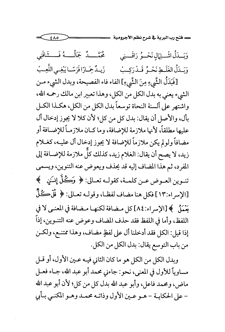 [فَبَدَلُ الشَّيءِ مِنَ الشَّيءِ] الفاء فاء الفصيحة، وبدل الشيء من الشيء يعني به بدل الكل من الكل، وهذا تعبير ابن مالك رحمه الله، واشتهر على ألسنة النحاة توسعاً بدل الكل من الكل، هكذا الكل بأل، والأصل أن يقال: بدل كل من كل؛ لأن كلا لا يجوز إدخال أل عليها مطلقاً، لأنها ملازمة للإضافة، وما كان ملازماً للإضافة أو مضافاً ولولم يكن ملازماً للإضافة لا يجوز إدخال أل عليه، كغلام زيد، لا يصح أن يقال: الغلام زيد، كذلك كلٌّ ملازمة للإضافة إلى المفرد، ثم هذا المضاف إليه قد يحذف ويعوض عنه التنوين، ويسمى تنوين العوض عن كلمة، كقوله تعالى: (وَكُلَّ إِنسَانٍ) [الإسراء:13] فكل هنا مضاف لفظا، وقوله تعالى: (قُلْ كُلٌّ يَعْمَلُ) [الإسراء:84] كل مضافة لكنها مضافة في المعنى لا في اللفظ، وأما في اللفظ فقد حذف المضاف وعوض عنه التنوين، إذاً إذا قيل: الكل فقد أدخلنا أل على لفظٍ مضاف، وهذا ممتنع، ولكن من باب التوسع يقال: بدل الكل من الكل.