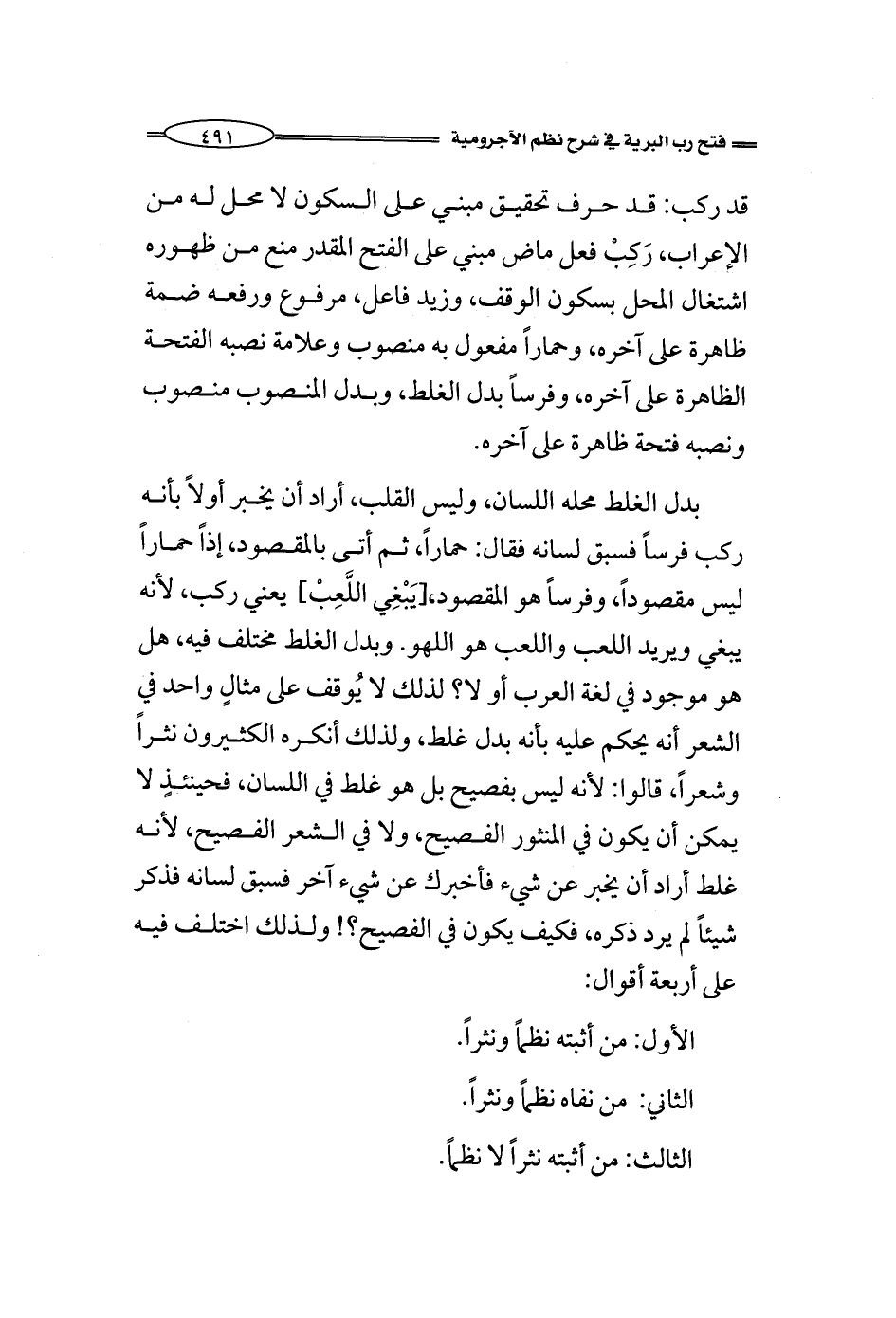 بدل الغلط محله اللسان، وليس القلب، أراد أن يخبر أولاً بأنه ركب فرساً فسبق لسانه فقال: حماراً، ثم أتى بالمقصود، إذاً حماراً ليس مقصوداً، وفرساً هو المقصود، [يَبْغِي اللَّعِبْ] يعني ركب، لأنه يبغي ويريد اللعب واللعب هو اللهو. وبدل الغلط مختلف فيه، هل هو موجود في لغة العرب أو لا؟ لذلك لا يُوقف على مثالٍ واحد في الشعر أنه يحكم عليه بأنه بدل غلط، ولذلك أنكره الكثيرون نثراً وشعراً، قالوا: لأنه ليس بفصيح بل هو غلط في اللسان، فحينئذٍ لا يمكن أن يكون في المنثور الفصيح، ولا في الشعر الفصيح، لأنه غلط أراد أن يخبر عن شيء فأخبرك عن شيء آخر فسبق لسانه فذكر شيئاً لم يرد ذكره، فكيف يكون في الفصيح؟! ولذلك اختلف فيه أربعة أقوال: