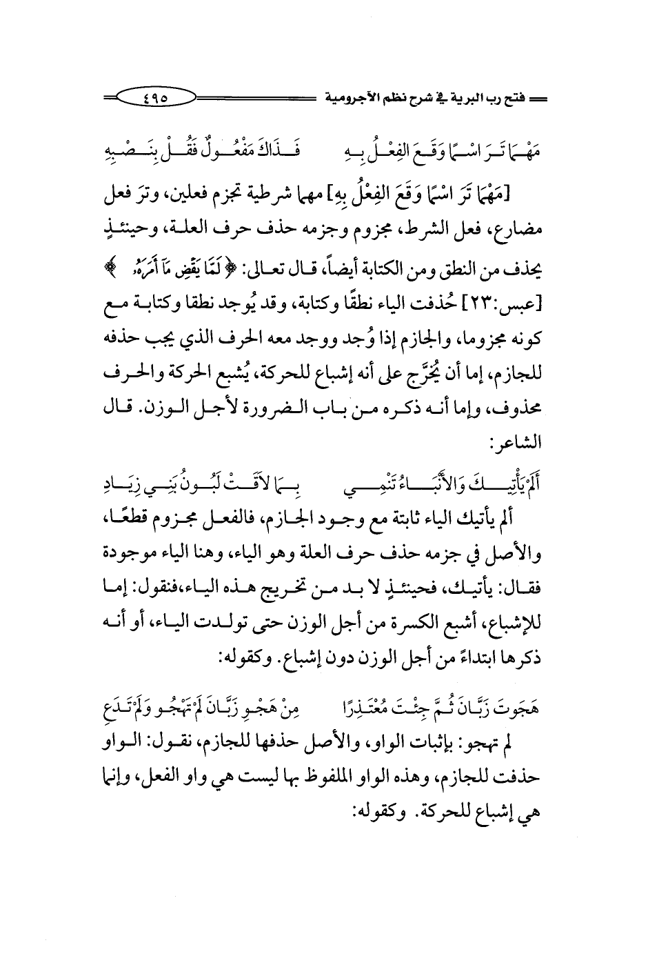 [مَهْمَا تَرَ اسْمًا وَقَعَ الفِعْلُ بِهِ] مهما شرطية تجزم فعلين، وترَ فعل مضارع، فعل الشرط، مجزوم وجزمه حذف حرف العلة، وحينئذٍ يحذف من النطق ومن الكتابة أيضاً، قال تعالى: (لَمَّا يَقْضِ مَا أَمَرَهُ) [عبس:23] حُذفت الياء نطقًا وكتابة، وقد يُوجد نطقا وكتابة مع كونه مجزوما، والجازم إذا وُجد ووجد معه الحرف الذي يجب حذفه للجازم، إما أن يُخرَّج على أنه إشباع للحركة، يُشبع الحركة والحرف محذوف، وإما أنه ذكره من باب الضرورة لأجل الوزن. قال الشاعر: