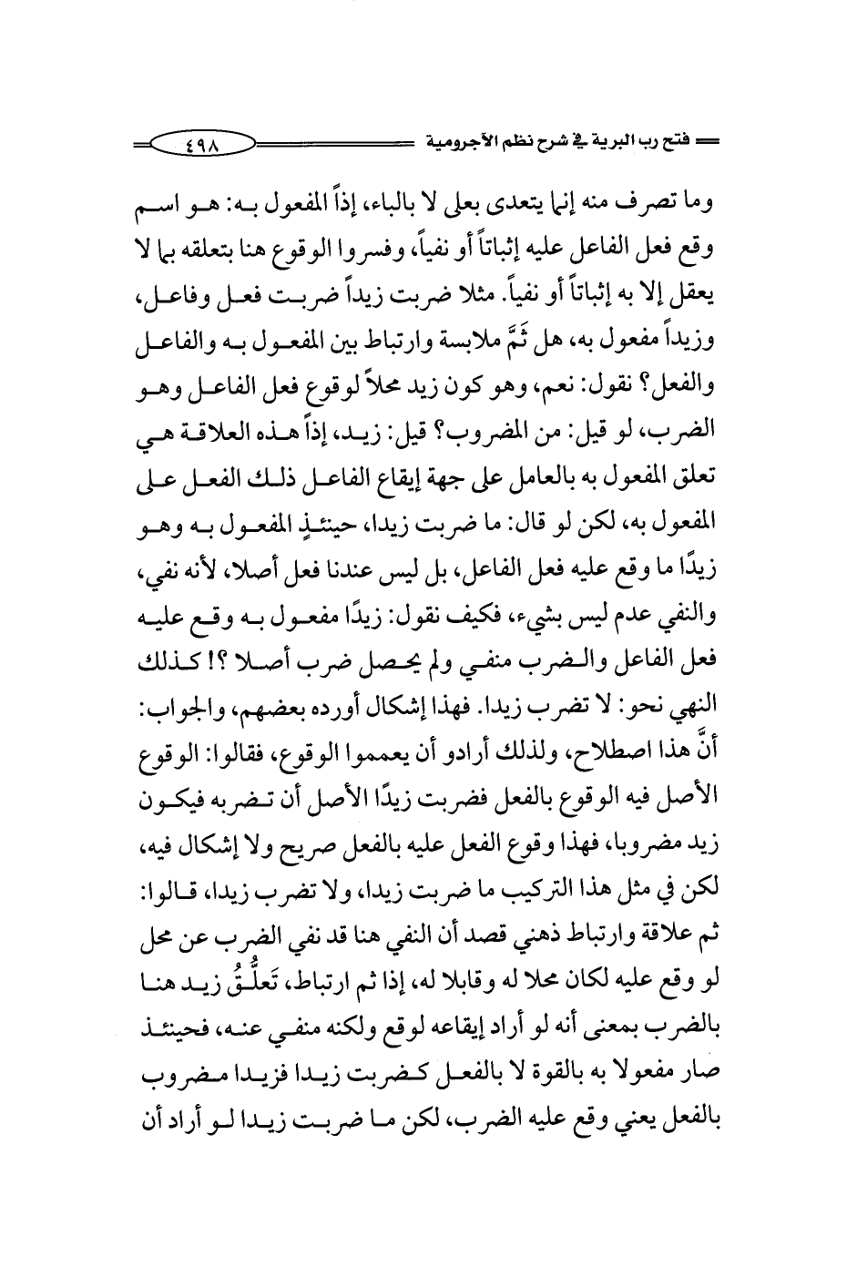 وما تصرف منه إنما يتعدى بعلى لا بالباء، إذاً المفعول به: هو اسم وقع فعل الفاعل عليه إثباتاً أو نفياً، وفسروا الوقوع هنا بتعلقه بما لا يعقل إلا به إثباتاً أو نفياً. مثلا ضربت زيداً ضربت فعل وفاعل، وزيداً مفعول به، هل ثَمَّ ملابسة وارتباط بين المفعول به والفاعل والفعل؟ نقول: نعم، وهو كون زيد محلاً لوقوع فعل الفاعل وهو الضرب، لو قيل: من المضروب؟ قيل: زيد، إذاً هذه العلاقة هي تعلق المفعول به بالعامل على جهة إيقاع الفاعل ذلك الفعل على المفعول به، لكن لو قال: ما ضربت زيدا، حينئذٍ المفعول به وهو زيدًا ما وقع عليه فعل الفاعل، بل ليس عندنا فعل أصلا، لأنه نفي، والنفي عدم ليس بشيء، فكيف نقول: زيدًا مفعول به وقع عليه فعل الفاعل والضرب منفي ما حصل ضرب أصلا؟! كذلك النهي نحو: لا تضرب زيدا. فهذا إشكال أورده بعضهم، والجواب: أنَّ هذا اصطلاح، ولذلك أرادو أن يعمموا الوقوع، فقالوا: الوقوع الأصل فيه الوقوع بالفعل فضربت زيدًا الأصل أن تضربه فيكون زيد مضروبا، فهذا وقوع الفعل عليه بالفعل صريح ولا إشكال فيه، لكن في مثل هذا التركيب ما ضربت زيدا، ولا تضرب زيدا، قالوا: ثم علاقة وارتباط ذهني قصد أن النفي هنا قد نفي الضرب عن محل لو وقع عليه لكان محلا له وقابلا له، إذا ثم ارتباط، تعلق زيد هنا بالضرب بمعنى أنه لو أراد إيقاعه لوقع ولكنه منفي عنه، فحينئذ صار مفعولا به بالقوة لا بالفعل كضربت زيدا فزيدا مضروب بالفعل يعني وقع عليه الضرب، لكن ما ضربت زيدا لو أراد أن