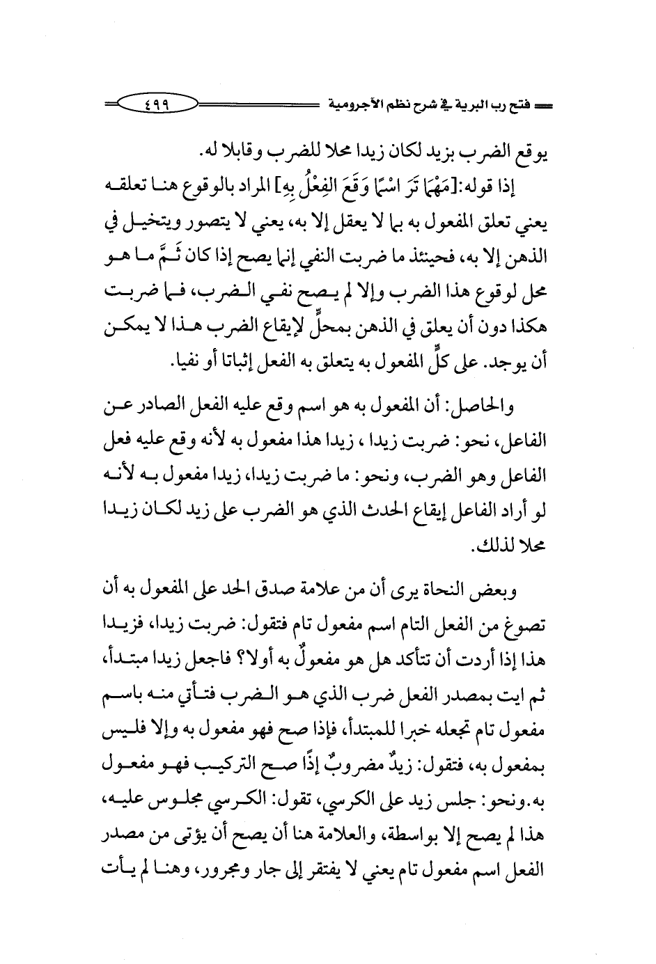 وبعض النحاة يرى أن من علامة صدق الحد على المفعول به أن تصوغ من الفعل التام اسم مفعول تام فتقول: ضربت زيدا، فزيدا هذا إذا أردت أن تتأكد هل هو مفعول به أولا؟ فاجعل زيدا مبتدأ، ثم ايت بمصدر الفعل ضرب الذي هو الضرب فتأتي منه باسم مفعول تام تجعله خبرا للمبتدأ، فإذا صح فهو مفعول به وإلا فليس بمفعول به، فتقول: زيدٌ مضروبٌ إذًا صح التركيب فهو مفعول به. ونحو: جلس زيد على الكرسي، تقول: الكرسي مجلوس عليه، هذا لم يصح إلا بواسطة، والعلامة هنا أن يصح أن يؤتى من مصدر الفعل اسم مفعول تام يعني لا يفتقر إلى جار ومجرور، وهنا لم يأت