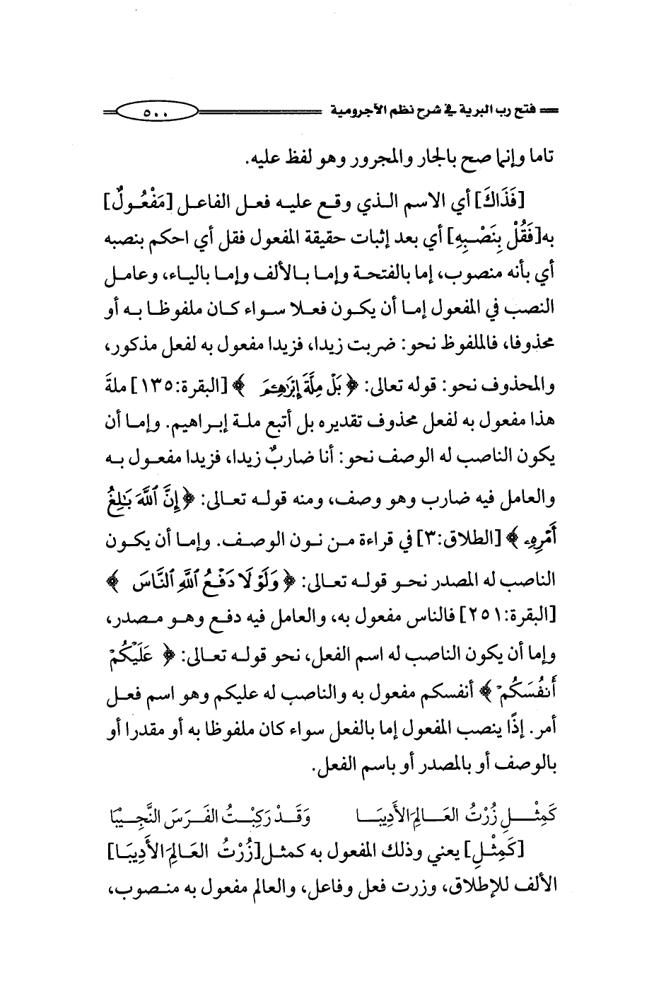 [فَذَاكَ] أي الاسم الذي وقع عليه فعل الفاعل [مَفْعُولٌ] به [فَقُلْ بِنَصْبِهِ] أي بعد إثبات حقيقة المفعول فقل أي احكم بنصبه أي بأنه منصوب، إما بالفتحة وإما بالألف وإما بالياء، وعامل النصب في المفعول إما أن يكون فعلا سواء كان ملفوظا به أو محذوفا، فالملفوظ نحو: ضربت زيدا، فزيدا مفعول به لفعل مذكور، والمحذوف نحو: قوله تعالى: (بَلْ مِلَّةَ إِبْرَاهِيمَ) [البقرة:135] ملةَ هذا مفعول به لفعل محذوف تقديره بل أتبع ملة إبراهيم. وإما أن يكون الناصب له الوصف نحو: أنا ضاربٌ زيدا، فزيدا مفعول به والعامل فيه ضارب وهو وصف، ومنه قوله تعالى: (إِنَّ اللَّهَ بَالِغُ أَمْرِهِ) [الطلاق:3] في قراءة من نون الوصف. وإما أن يكون الناصب له المصدر نحو قوله تعالى: (وَلَوْلا دَفْعُ اللَّهِ النَّاسَ) [البقرة:251] فالناس مفعول به، والعامل فيه دفع وهو مصدر، وإما أن يكون الناصب له اسم الفعل، نحو قوله تعالى: عَلَيْكُمْ) أَنْفُسَكُمْ () أنفسكم مفعول به والناصب له عليكم وهو اسم فعل أمر. إذًا ينصب المفعول إما بالفعل سواء كان ملفوظا به أو مقدرا أو بالوصف أو بالمصدر أو باسم الفعل.