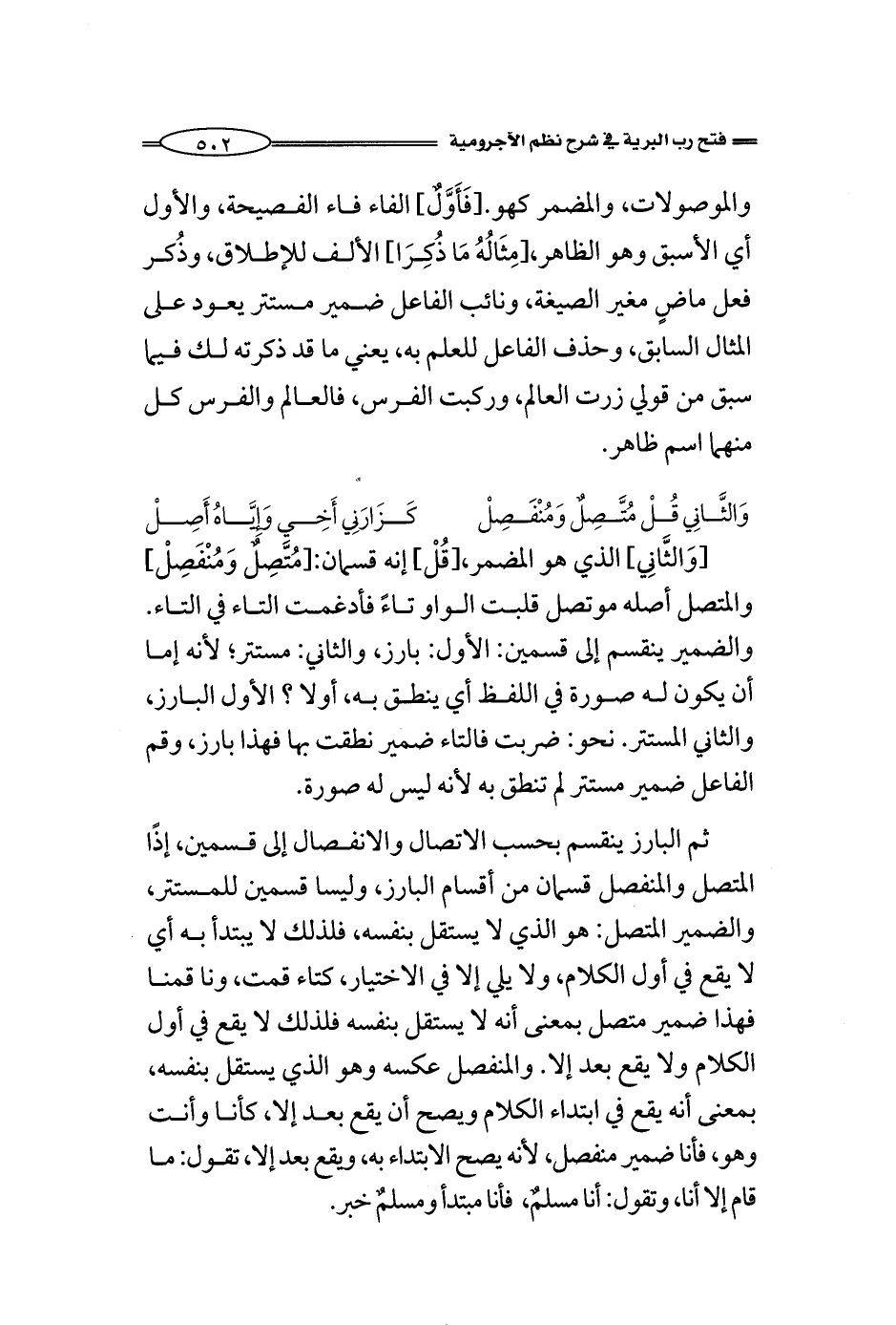 [وَالثَّانِي] الذي هو المضمر، [قُلْ] إنه قسمان: [مُتَّصِلٌ وَمُنْفَصِلْ] والمتصل أصلها موتصل قلبت الواو تاءا فأدغمت التاء في التاء. والضمير ينقسم إلى قسمين: الأول: بارز، والثاني: مستتر؛ لأنه إما أن يكون له صورة في اللفظ أي ينطق به، أولا؟ الأول البارز، والثاني المستتر. نحو: ضربت فالتاء ضمير نطقت بها فهذا بارز, وقم الفاعل ضمير مستتر لم تنطق به لأنه ليس له صورة.