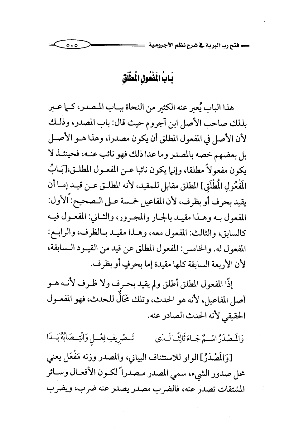 هذا الباب يُعبر عنه الكثير من النحاة بباب المصدر، كما عبر بذلك صاحب الأصل ابن آجروم حيث قال: باب المصدر، وذلك لأن الأصل في المفعول المطلق أن يكون مصدرا، وهذا هو الأصل بل بعضهم خصه بالمصدر وما عدا ذلك فهو نائب عنه، فحينئذ لا يكون مفعولاً مطلقا، وإنما يكون نائبا عن المفعول المطلق، [بَابُ المَفْعُولِ المُطْلَقِ] المطلق مقابل للمقيد، لأنه المطلق عن قيد ٍإما أن يقيد بحرف أو بظرف، لأن المفاعيل خمسة على الصحيح: الأول: المفعول به هذا مقيد بالجار والمجرور، والثاني: المفعول فيه كالسابق، والثالث: المفعول معه، وهذا مقيد بالظرف، والرابع: المفعول له. والخامس: المفعول المطلق عن قيد من القيود السابقة، لأن الأربعة السابقة كلها مقيدة إما بحرفٍ أو بظرف.