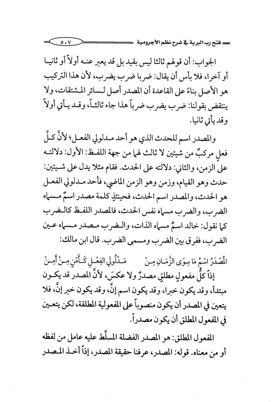 الجواب: أن قولهم ثالثا ليس بقيد بل قد يعبر عنه أولاً أو ثانيا أو آخرا، فلا بأس أن يقال: ضربا ضرب يضرب، لأن هذا التركيب هو الأصل بناءاً على أن القاعدة أن المصدر أصل لسائر المشتقات، ولا ينتقض بقولنا: ضرب يضرب ضرباً هذا جاء ثالثاً، وقد يأتي أولاً وقد يأتي ثانيا.