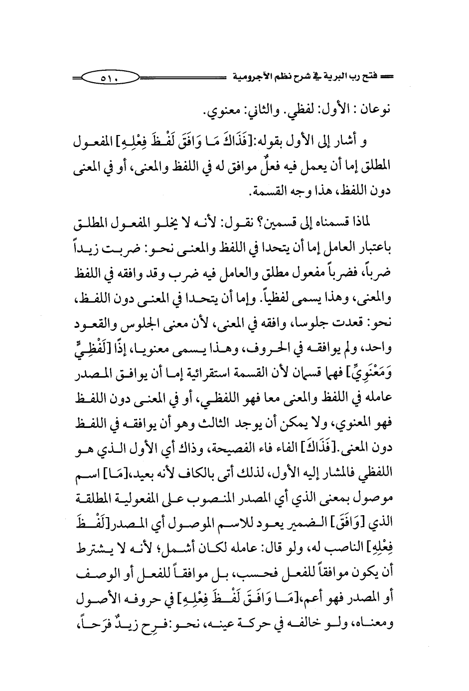 لماذا قسمناه إلى قسمين؟ نقول: لأنه لا يخلو المفعول المطلق باعتبار العامل إما أن يتحدا في اللفظ والمعنى نحو: ضربت زيداً ضرباً، فضرباً مفعول مطلق والعامل فيه ضرب وقد وافقه في اللفظ والمعنى، هذا يسمى لفظياً. وإما أن يتحدا في المعنى دون اللفظ، نحو: قعدت جلوسا، وافقه في المعنى، لأن معنى الجلوس والقعود واحد، ولم يوافقه في الحروف، هذا يسمى معنويا، إذًا [لَفْظِيٍّ وَمَعْنَوِيِّ] فهما قسمان لأن القسمة استقرائية إما أن يوافق المصدر عامله في اللفظ والمعنى معا فهو اللفظي، أو في المعنى دون اللفظ فهو المعنوي، ولا يمكن أن يوجد الثالث وهو أن يوافقه في اللفظ دون المعنى. [فَذَاكَ] الفاء فاء الفصيحة، وذاك أي الأول الذي هو اللفظي فالمشار إليه الأول، لذلك أتى بالكاف لأنه بعيد، [مَا] اسم موصول بمعنى الذي أي مصدرٌ منصوبٌ على المفعولية المطلقة [وَافَقَ] الضمير يعود للاسم الموصول أي المصدر [لَفْظَ فِعْلِهِ] الناصب له، ولو قال: عامله لكان أشمل؛ لأنه لا يشترط أن يكون موافقاً للفعل فحسب، بل موافقاً للفعل أو الوصف أو المصدر فهو أعم، [مَا وَافَقَ لَفْظَ فِعْلِهِ] في حروفه الأصول ومعناه، ولو خالفه في حركة عينه، نحو: فرِح زيدٌ فرَحاً،
