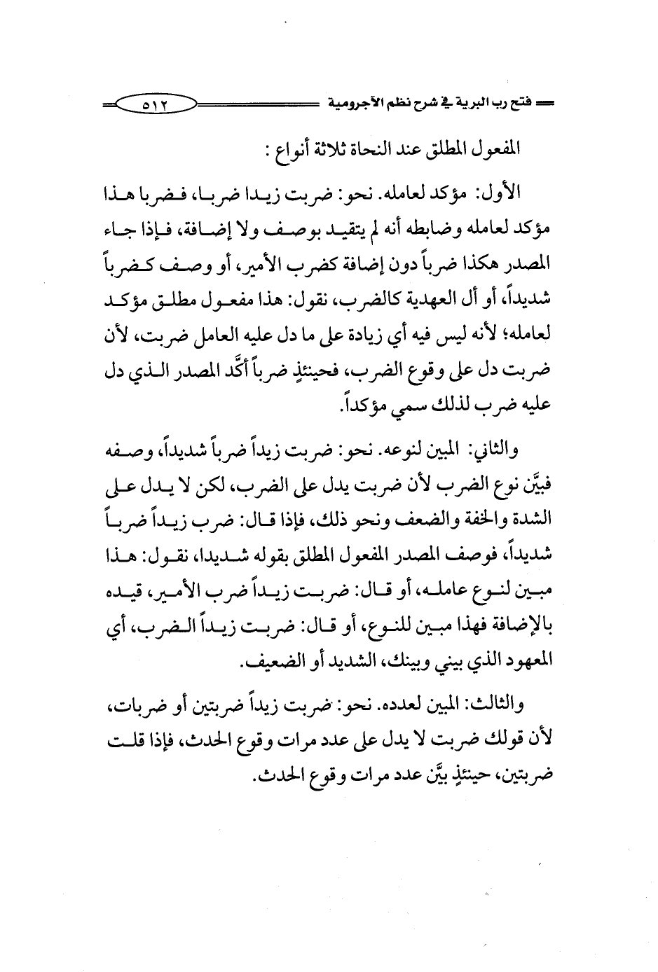 والثاني: المبين لنوعه. نحو: ضربت زيداً ضرباً شديداً، وصفه فبين نوع الضرب لأن ضربت يدل على الضرب، لكن لا يدل على الشدة والخفة والضعف ونحو ذلك، فإذا قال: ضربت زيداً ضرباً شديداً، فوصف المصدر المفعول المطلق بقوله شديدا، نقول: هذا مبين لنوع عامله، أو قال: ضربت زيداً ضرب الأمير، قيده بالإضافة فهذا مبين للنوع، أو قال: ضربت زيداً الضرب، أي المعهود الذي بيني وبينك، الشديد أو الضعيف.