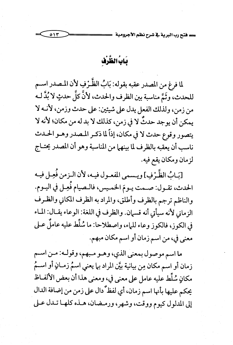 [بَابُ الظَّرْفِ] ويسمى المفعول فيه، لأن الزمن فُعِل فيه الحدث، تقول: صمت يومَ الخميس، فالصيام فُعِل في اليوم. والناظم ترجم بالظرف وأطلق، والمراد به الظرف المكاني والظرف الزماني لأنه سيأتي أنه قسمان. والظرف في اللغة: الوعاء يقال: الماء في الكوز، فالكوز وعاء للماء، واصطلاحا: ما سُلِّط عليه عاملٌ على معنى في، من اسم زمان أو اسم مكان مبهم.