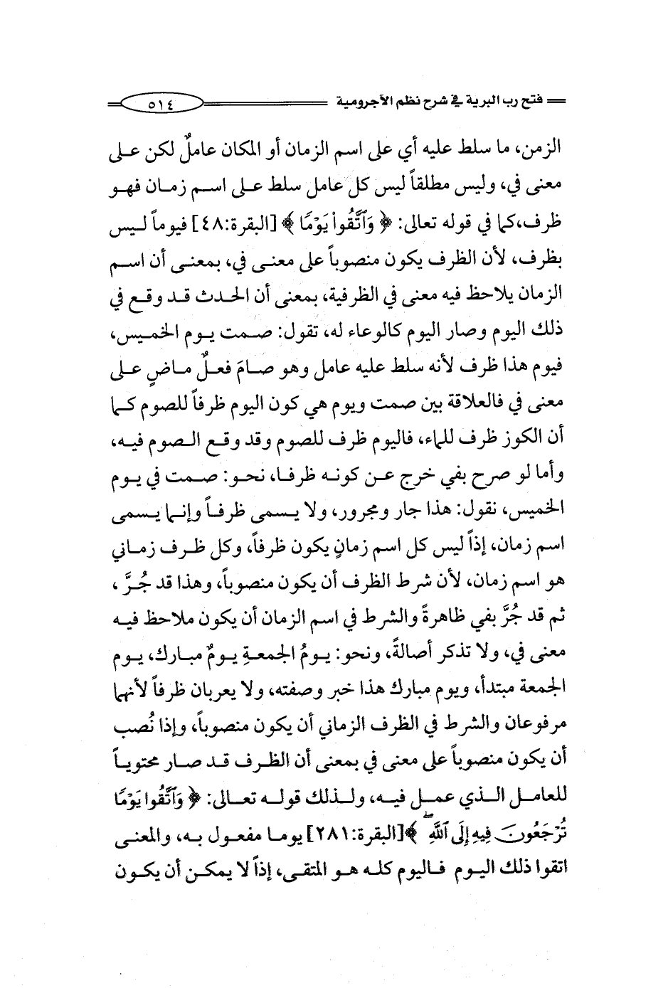 الزمن، ما سلط عليه أي على اسم الزمان أو المكان عاملٌ لكن على معنى في، وليس مطلقاً ليس كل عامل سلط على اسم زمان فهو ظرف، كما في قوله: (واتقوا يَوْمًا)) [البقرة:48] فيوماً ليس بظرف، لأن الظرف يكون منصوباً على معنى في، بمعنى أن اسم الزمان يلاحظ فيه معنى في الظرفية، بمعنى أن الحدث قد وقع في ذلك اليوم وصار اليوم كالوعاء له، تقول: صمت يوم الخميس، فيوم هذا ظرف لأنه سلط عليه عامل وهو صامَ فعلٌ ماضٍ على معنى في فالعلاقة بين صمت ويوم هي كون اليوم ظرفاً للصوم كما أن الكوز ظرف للماء، فاليوم ظرف للصوم وقد وقع الصوم فيه، أما لو صرح بفي خرج عن كونه ظرفا، لو قال: صمت في يوم الخميس، نقول: هذا جار ومجرور، ولا يسمى ظرفاً وإنما يسمى اسم زمان، إذاً ليس كل اسم زمانٍ يكون ظرفاً، وكل ظرف زماني هو اسم زمان، لأن شرط الظرف أن يكون منصوباً، وهذا قد جُرَّ، ثم قد جُرَّ بفي ظاهرةً والشرط في اسم الزمان أن يكون ملاحظ فيه معنى في، ولا تذكر أصالةً، ونحو: يومُ الجمعةِ يومٌ مبارك، يوم الجمعة مبتدأ، ويوم مبارك هذا خبر وصفته، ولا يعربان ظرفاً لأنهما مرفوعان والشرط في الظرف الزماني أن يكون منصوباً، وإذا نُصب أن يكون منصوباً على معنى في بمعنى أن الظرف قد صار محتوياً للعامل الذي عمل فيه، ولذلك قوله: (واتقوا يَوْمًا تُرْجَعُونَ فِيهِ إِلَى اللَّهِ) [البقرة:281] يوما مفعول به، والمعنى اتقوا ذاك اليوم فاليوم كله هو المتقى، إذاً لا يمكن أن يكون