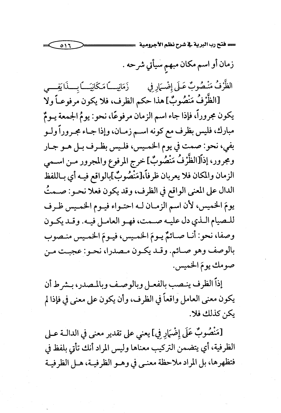 [الظَّرْفُ مَنْصُوبٌ] هذا حكم الظرف، فلا يكون مرفوعاً ولا يكون مجروراً، فإذا جاء اسم الزمان مرفوعًا، نحو: يومُ الجمعة يومٌ مبارك، فليس بظرف مع كونه اسم زمان، وإذا جاء مجروراً ولو بفي، نحو: صمت في يوم الخميس، فليس بظرف بل هو جار ومجرور، إذاً [الظَّرْفُ مَنْصُوبٌ] خرج المرفوع والمجرور من اسمي الزمان والمكان فلا يعربان ظرفاً، [مَنْصُوبٌ] بالواقع فيه أي باللفظ الدال على المعنى الواقع في الظرف، وقد يكون فعلا نحو: صمتُ يومَ الخميس، لأن اسم الزمان له احتواء فيوم الخميس ظرف للصيام الذي دل عليه صمت، فهو العامل فيه. وقد يكون وصفا، نحو: أنا صائمٌ يومَ الخميس، فيومَ الخميس منصوب بالوصف وهو صائم. وقد يكون مصدرا، نحو: عجبت من صومك يومَ الخميس.