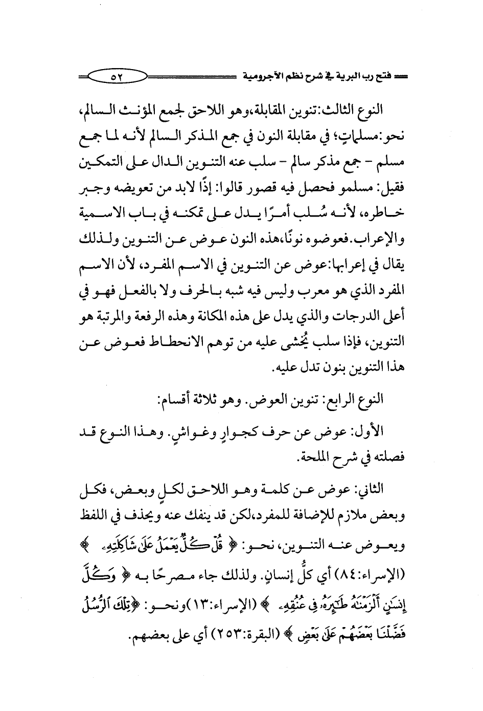 النوع الثالث: تنوين المقابلة، وهو اللاحق لجمع المؤنث السالم، نحو: مسلماتٍ؛ لأنه لما جمع مسلم - جمع مذكر سالم - سلب عنه التنوين الدال على التمكين فقيل: مسلمو فحصل فيه قصور قالوا: إذًا لابد من تعويضه وجبر خاطره، لأنه سُلب أمرًا يدل على تمكنه في باب الاسمية والإعراب. فعوضوه نونًا، هذه النون عوض عن التنوين ولذلك يقال في إعرابها: عوض عن التنوين في الاسم المفرد، لأن الاسم المفرد الذي هو معرب وليس فيه شبه بالحرف ولا بالفعل فهو في أعلى الدرجات والذي يدل على هذه المكانة وهذه الرفعة والمرتبة هو التنوين، فإذا سلب يُخشى عليه من توهم الانحطاط فعوض عن هذا التنوين بنون تدل عليه.
