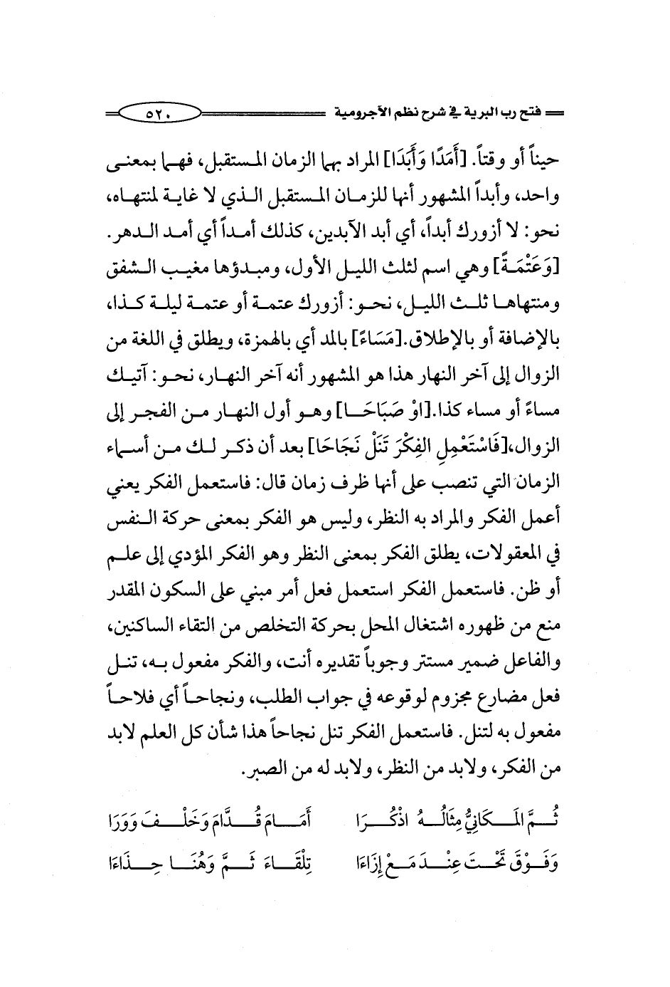 حيناً أو وقتاً. [أَمَدًا وَأَبَدَا] المراد بهما الزمان المستقبل، فهما بمعنى واحد، وأبداً المشهور أنها للزمان المستقبل الذي لا غاية لمنتهاه، نحو: لا أزورك أبداً، أي أبد الآبدين، كذلك أمداً أي أمد الدهر. [وَعَتْمَةً] وهي اسم لثلث الليل الأول، ومبدؤها مغيب الشفق ومنتهاها ثلث الليل، نحو: أزورك عتمة أو عتمة ليلة كذا، بالإضافة أو بالإطلاق. [مَسَاءً] بالمد أي بالهمزة، ويطلق في اللغة من الزوال إلى آخر النهار هذا هو المشهور أنه آخر النهار، نحو: آتيك مساءاً أو مساء كذا. [اوْ صَبَاحَا] وهو أول النهار من الفجر إلى الزوال، [فَاسْتَعْمِلِ الفِكْرَ تَنَلْ نَجَاحَا] بعد أن ذكر لك من أسماء الزمان التي تنصب على أنها ظرف زمان قال: فاستعمل الفكر يعني أعمل الفكر والمراد به النظر، وليس هو الفكر بمعنى حركة النفس في المعقولات، يطلق الفكر بمعنى النظر وهو الفكر المؤدي إلى علم أو ظن. فاستعمل الفكر استعمل فعل أمر مبني على السكون المقدر منع من ظهوره اشتغال المحل بحركة التخلص من التقاء الساكنين، والفاعل ضمير مستتر وجوباً تقديره أنت، والفكر مفعول به، تنل فعل مضارع مجزوم لوقوعه في جواب الطلب، ونجاحاً أي فلاحاً مفعول به لتنل. فاستعمل الفكر تنل نجاحاً هذا شأن كل العلم لابد من الفكر، ولابد من النظر، ولابد له من الصبر.