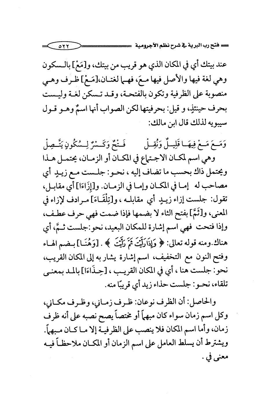 وَمَعَ مَعْ فِيهَا قَلِيلٌ وَنُقِلْ ... فَتْحٌ وَكَسْرٌ لِسُكُونٍ يَتَّصِلْ ... وهي اسم لمكان الاجتماع في المكان أو الزمان، يحتمل هذا ويحتمل ذاك بحسب ما تضاف إليه، نحو: جلست مع زيدٍ أي مصاحب له إما في المكان وإما في الزمان. و [إِزَاءَا] أي مقابل، تقول: جلست إزاء زيدٍ أي مقابله، و [تِلْقَاءَ] مرادف لإزاء في المعنى، و [ثَمَّ] بفتح الثاء لا بضمها فإذا ضمت فهي حرف عطف، وإذا فتحت فهي اسم إشارة للمكان البعيد، نحو: جلست ثمَّ، أي هناك. ومنه قوله تعالى: (وَإِذَا رَأَيْتَ ثَمَّ رَأَيْتَ) (الإنسان: من الآية20). [وَهُنَا] بضم الهاء وفتح النون مع التخفيف، اسم إشارة يشار به إلى المكان القريب، نحو: جلست هنا، أي في المكان القريب، [حِذَاءَا] بالمد بمعنى تلقاء، نحو: جلست حذاء زيد أي قريبًا منه.