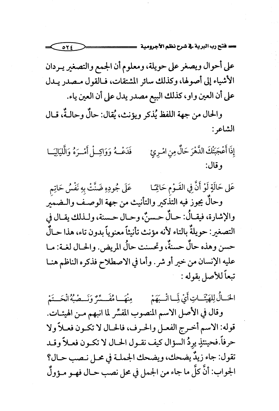 وحالٌ يجوز فيه التذكير والتأنيث من جهة الوصف والضمير والإشارة، فيقالُ: حالٌ حسنٌ, وحال حسنة، ولذلك يقال في التصغير: حويلةٌ بالتاء لأنه مؤنث تأنيثاً معنوياً بدون تاء، هذا حالٌ حسن وهذه حالٌ حسنةٌ, وتحسنت حالُ المريض. والحال لغة: ما عليه الإنسان من خير أو شر. وأما في الاصطلاح فذكره الناظم هنا تبعاً للأصل بقوله: