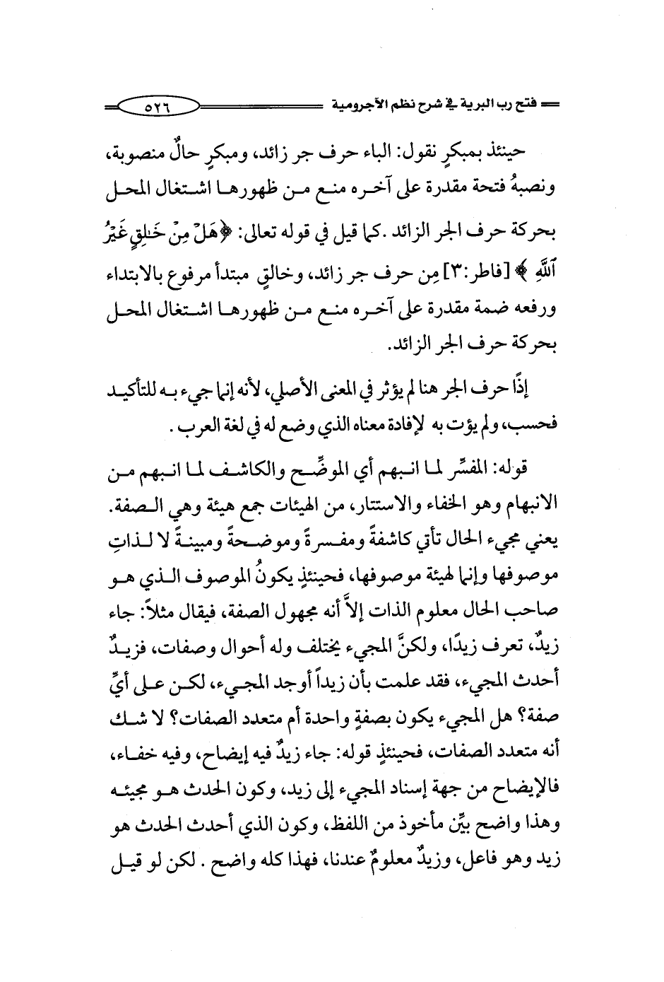 قوله: المفسِّر لما انبهم أي الموضِّح والكاشف لما انبهم من الانبهام وهو الخفاء والاستتار، من الهيئات جمع هيئة وهي الصفة. يعني مجيء الحال تأتي كاشفةً ومفسرةً وموضحةً ومبينةً لا لذاتِ موصوفها وإنما لهيئة موصوفها، فحينئذٍ يكونُ الموصوف الذي هو صاحب الحال معلوم الذات إلاَّ أنه مجهول الصفة، فيقال مثلاً: جاء زيدٌ، تعرف زيدًا، ولكنَّ المجيء يختلف وله أحوال وصفات، فزيدٌ أحدث المجيء، فقد علمت بأن زيداً أوجد المجيء، لكن على أيِّ صفة؟ هل المجيء يكون بصفةٍ واحدة أم متعدد الصفات؟ لا شك أنه متعدد الصفات، فحينئذٍ قوله: جاء زيدٌ فيه إيضاح، وفيه خفاء، فالإيضاح من جهة إسناد المجيء إلى زيد، وكون الحدث هو مجيئه وهذا واضح مأخوذ من اللفظ، وكون الذي أحدث الحدث هو زيد وهو فاعل، وزيدٌ معلومٌ عندنا، فهذا كله واضح. لكن لو قيل