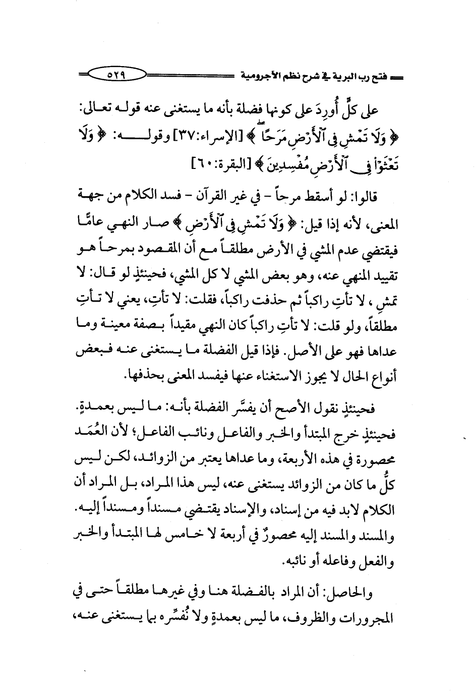 والحاصل: أن المراد بالفضلة هنا وفي غيرها مطلقاً حتى في المجرورات والظروف، ما ليس بعمدةٍ ولا نُفسِّره بما يستغنى عنه،