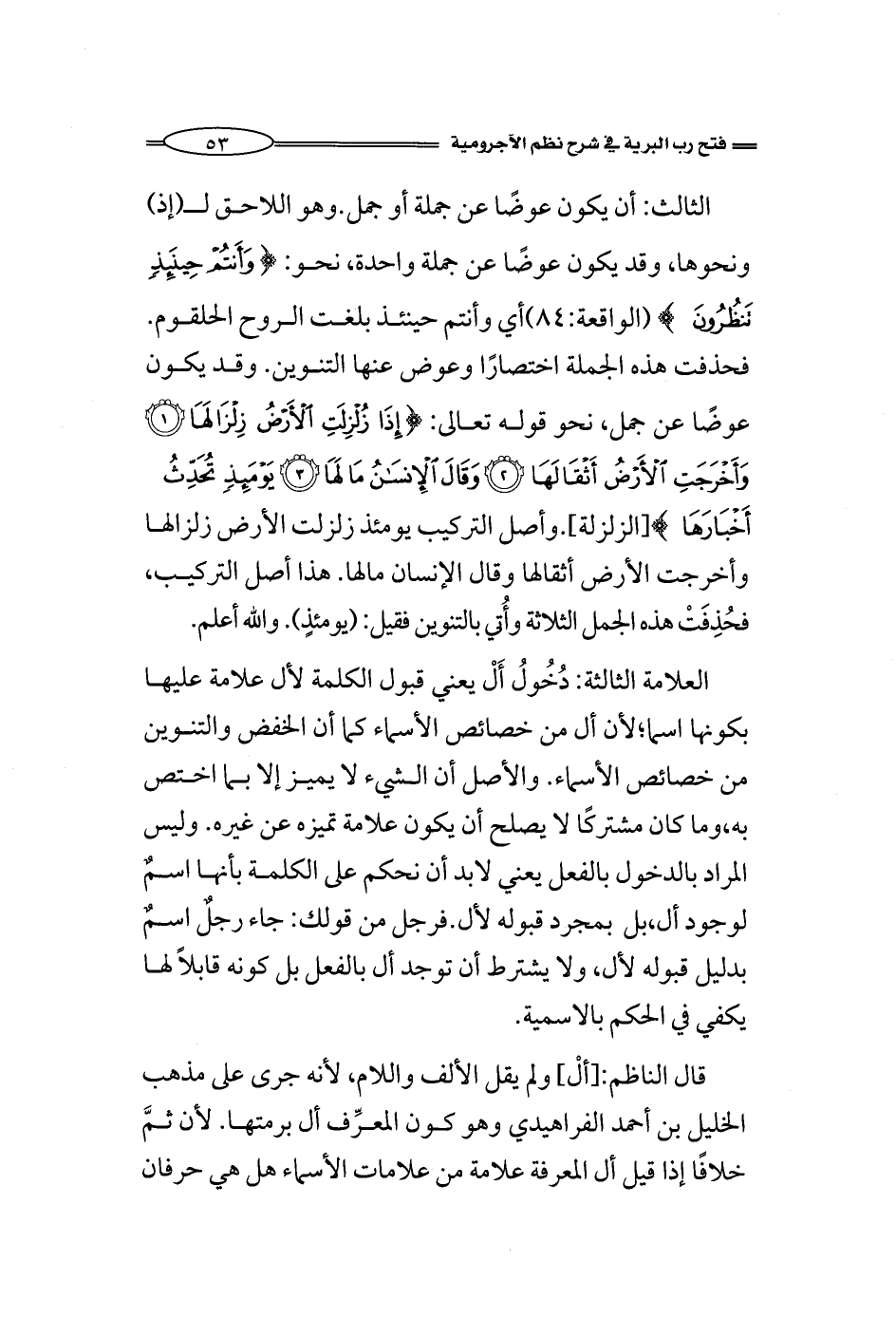 العلامة الثالثة: دُخُولُ أَلْ يعني قبول الكلمة لأل علامة عليها بكونها اسما؛ لأن أل من خصائص الأسماء كما أن الخفض والتنوين من خصائص الأسماء. والأصل أن الشيء لا يميز إلا بما اختص به، وما كان مشتركًا لا يصلح أن يكون علامة تميزه عن غيره. وليس المراد بالدخول بالفعل يعني لابد أن نحكم على الكلمة بأنها اسمٌ لوجود أل، بل بمجرد قبوله لأل. فرجل من قولك: جاء رجلٌ اسمٌ بدليل قبوله لأل، ولا يشترط أن توجد أل بالفعل بل كونه قابلاً لها يكفي في الحكم بالاسمية.