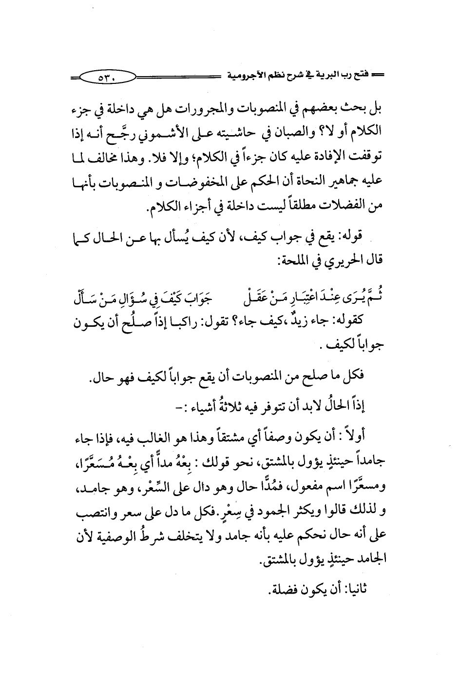 أولاً: أن يكون وصفاً أي مشتقاً وهذا هو الغالب فيه، فإذا جاء جامداً حينئذٍ يؤول بالمشتق، نحو قولك: بِعْهُ مداًّ أي بِعْهُ مُسَعَّراً، ومسعَّرًا اسم مفعول، فمُدًّا حال وهو دال على السِّعْر، وهو جامد، ولذلك قالوا ويكثر الجمود في سِعْرٍ. فكل ما دل على سعر وانتصب على أنه حال نحكم عليه بأنه جامد ولا يتخلف شرطُ الوصفية لأن الجامد حينئذٍ يؤول بالمشتق.