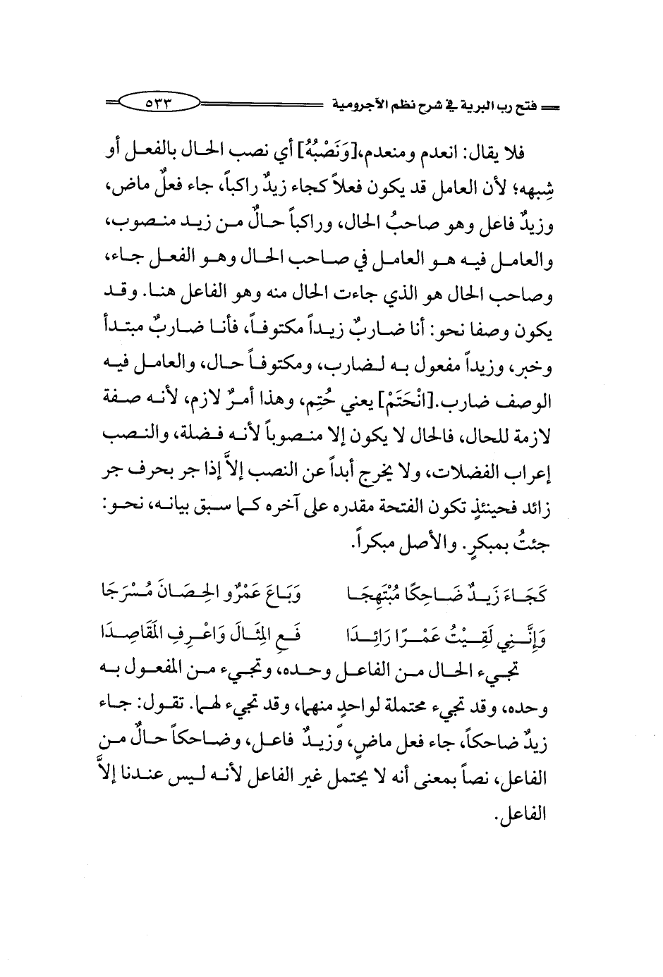 فلا يقال: انعدم ومنعدم، [وَنَصْبُهُ] أي نصب الحال بالفعل أو شِبهه؛ لأن العامل قد يكون فعلاً كجاء زيدٌ راكباً، جاء فعلٌ ماض، وزيدٌ فاعل وهو صاحبُ الحال، وراكباً حالٌ من زيد منصوب، والعامل فيه هو العامل في صاحب الحال وهو الفعل جاء، وصاحب الحال هو الذي جاءت الحال منه وهو الفاعل هنا. وقد يكون وصفا نحو: أنا ضاربٌ زيداً مكتوفاً، فأنا ضاربٌ مبتدأ وخبر، وزيداً مفعول به لضارب، ومكتوفاً حال، والعامل فيه الوصف ضارب. [انْحَتَمْ] يعني حُتِم، وهذا أمرٌ لازم، لأنه صفة لازمة للحال، الحال لا يكون إلا منصوباً لأنه فضلة، والنصب إعراب الفضلات، ولا يخرج أبداً عن النصب إلاَّ إذا جر بحرف جر زائد فحينئذٍ تكون الفتحة مقدره على آخره كما سبق بيانه، نحو: جئتُ بمبكرٍ. والأصل مبكراً.
