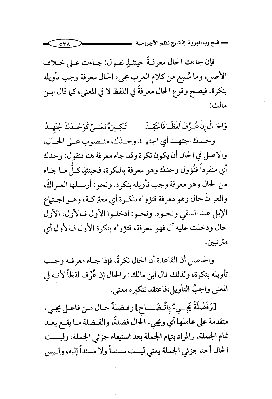 [وَفَضْلَةً يَجِيءُ بِاتِّضَاحِ] وفضلةًً حال من فاعل يجيء متقدمة على عاملها أي ويجيء الحال فضلةً، والفضلة ما يقع بعد تمام الجملة. والمراد بتمام الجملة بعد استيفاء جزئي الجملة، وليست الحال أحد جزئي الجملة يعني ليست مسنداً ولا مسنداً إليه، وليس