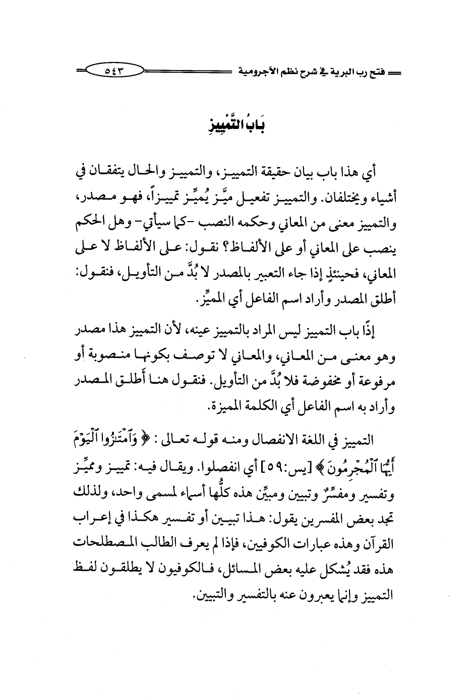 إذًا باب التمييز ليس المراد بالتمييز عينه، لأن التمييز هذا مصدر وهو معنى من المعاني، والمعاني لا توصف بكونها منصوبة أو مرفوعة أو مخفوضة فلا بُدَّ من التأويل. فنقول هنا أَطلق المصدر وأراد به اسم الفاعل أي الكلمة المميزة.