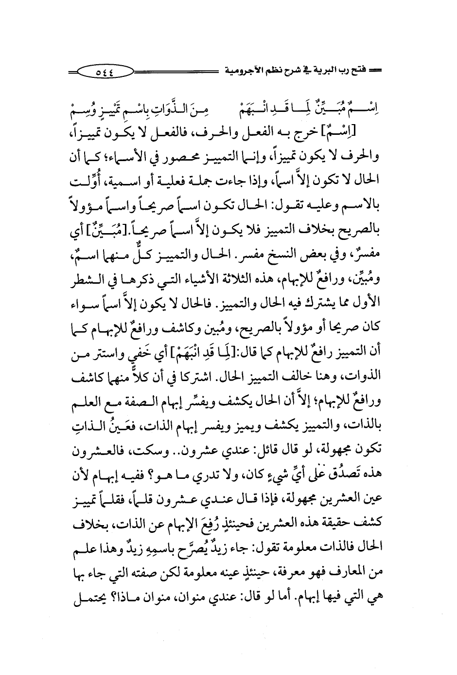 [اِسْمٌ] خرج به الفعل والحرف، فالفعل لا يكون تمييزاً، والحرف لا يكون تمييزاً، وإنما التمييز محصور في الأسماء؛ كما أن الحال لا تكون إلاَّ اسماً، وإذا جاءت جملة فعلية أو اسمية، أُوِّلت بالاسم وعليه تقول: الحال تكون اسماً صريحاً واسماً مؤولاً بالصريح بخلاف التمييز فلا يكون إلاَّ اسماً صريحاً. [مُبَيِّنٌ] أي مفسرٌ، وفي بعض النسخ مفسر. الحال والتمييز كلٌّ منهما اسمٌ، ومُبيِّن، ورافعٌ للإبهام، هذه الثلاثة الأشياء التي ذكرها في الشطر الأول مما يشترك فيه الحال والتمييز. فالحال لا يكون إلاَّ اسماً سواء كان صريحا أو مؤولاً بالصريح، ومُبين وكاشف ورافعٌ للإبهام كما أن التمييز رافعٌ للإبهام كما قال: [لِمَا قَدِ انْبَهَمْ] أي خَفي واستتر من الذوات، وهنا خالف التمييز الحال. اشتركا في أن كلاًّ منهما كاشف ورافعٌ للإبهام؛ إلاَّ أن الحال يكشف ويفسِّر إبهام الصفة مع العلم بالذات، والتمييز يكشف ويميز ويفسر إبهام الذات، فعَينُ الذاتِ تكون مجهولة، لو قال قائل: عندي عشرون .. وسكت، فالعشرون هذه تَصدُق على أيِّ شيءٍ كان، ولا تدري ما هو؟ ففيه إبهام لأن عين العشرين مجهولة، فإذا قال عندي عشرون قلماً، فقلماً تمييز كشف حقيقة هذه العشرين، فحينئذٍ رُفِعَ الإبهام عن الذات، بخلاف الحال فالذات معلومة يقول: جاء زيدٌ يُصرَّح باسمِهِ زيدٌ وهذا علم من المعارف فهو معرفة، حينئذٍ عينه معلومة لكن صفته التي جاء بها هي التي فيها إبهام. أما لو قال: عندي منوان، منوان ماذا؟ يحتمل