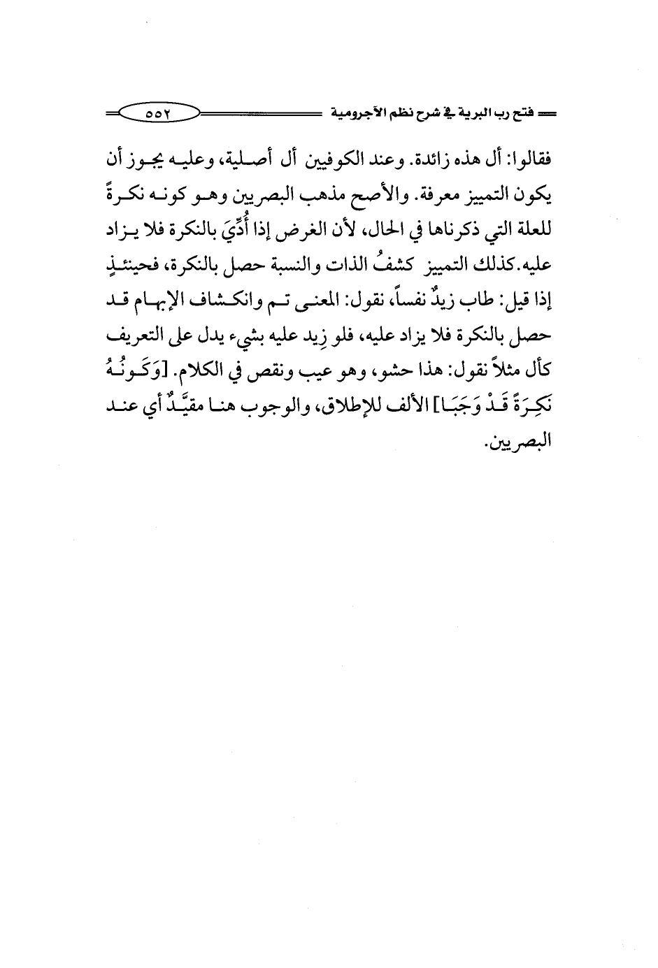 فقالوا: أل هذه زائدة. وعند الكوفيين أل أصلية، وعليه يجوز أن يكون التمييز معرفة. والأصح مذهب البصريين وهو كونه نكرةً للعلة التي ذكرناها في الحال، لأن الغرض إذا أُدِّيَ بالنكرة فلا يزاد عليه. كذلك التمييز كشفُ الذات والنسبة حصل بالنكرة، فحينئذٍ إذا قيل: طاب زيدٌ نفساً، نقول: المعنى تم وانكشاف الإبهام قد حصل بالنكرة فلا يزاد عليه، فلو زِيد عليه بشيء يدل على التعريف كأل مثلاً نقول: هذا حشو، وهو عيب ونقص في الكلام. [وَكَونُهُ نَكِرَةً قَدْ وَجَبَا] الألف للإطلاق، والوجوب هنا مقيَّدٌ أي عند البصريين.