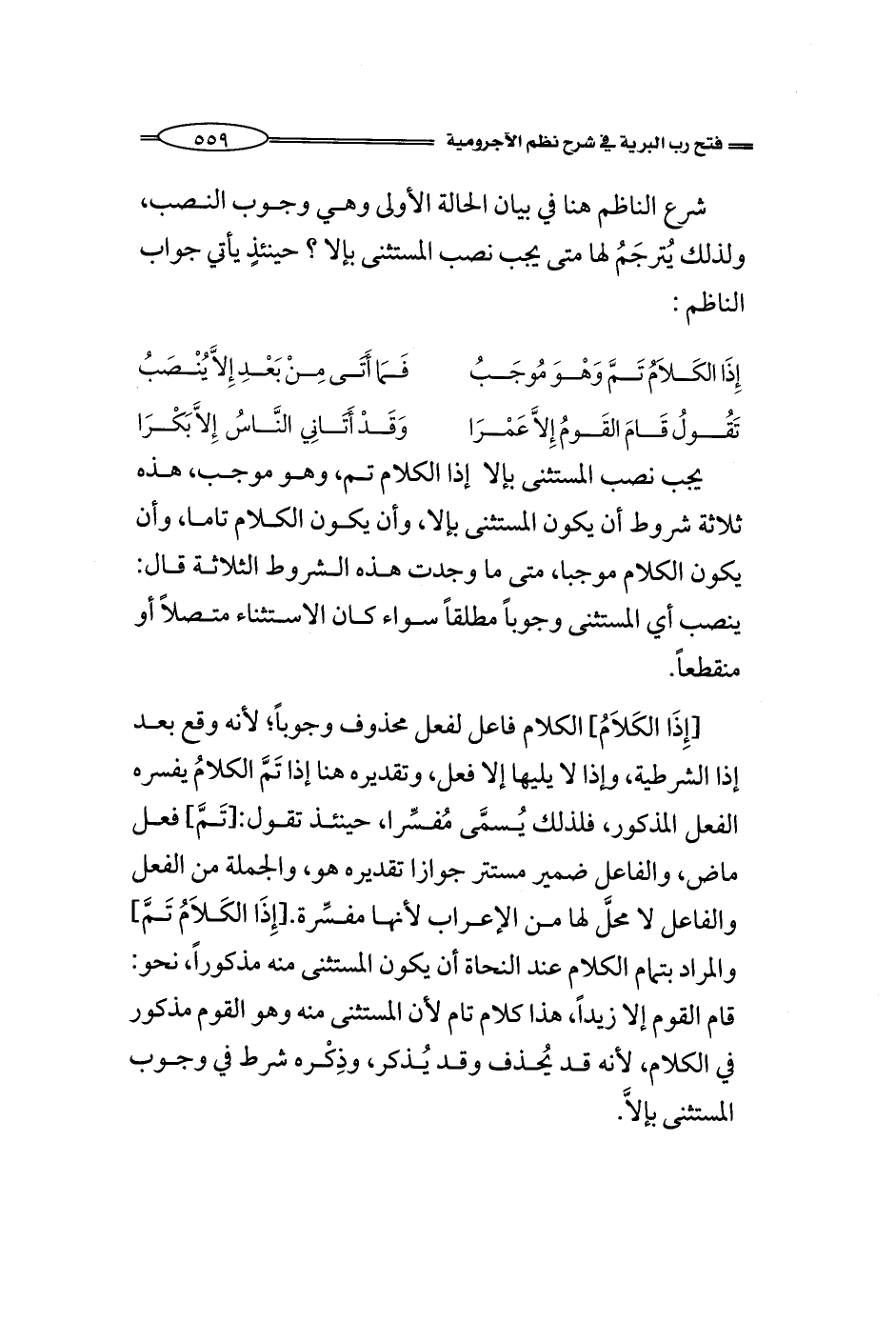 [إِذَا الكَلاَمُ] الكلام فاعل لفعل محذوف وجوباً؛ لأنه وقع بعد إذا الشرطية، وإذا لا يليها إلا فعل، وتقديره هنا إذا تَمَّ الكلامُ يفسره الفعل المذكور، فلذلك يُسمَّى مُفسِّرا، حينئذ تقول: [تَمَّ] فعل ماض، والفاعل ضمير مستتر جوازا تقديره هو، والجملة من الفعل والفاعل لا محلَّ لها من الإعراب لأنها مفسِّرة. [إِذَا الكَلاَمُ تَمَّ] والمراد بتمام الكلام عند النحاة أن يكون المستثنى منه مذكوراً، نحو: قام القوم إلا زيداً، هذا كلام تام لأن المستثنى منه وهو القوم مذكور في الكلام، لأنه قد يُحذف وقد يُذكر، وذِكْره شرط في وجوب المستثنى بإلاَّ.
