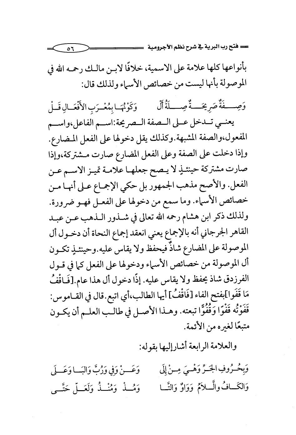 يعني تدخل على الصفة الصريحة: اسم الفاعل، واسم المفعول، والصفة المشبهة. وكذلك يقل دخولها على الفعل المضارع. وإذا دخلت على الصفة وعلى الفعل المضارع صارت مشتركة، وإذا صارت مشتركة حينئذٍ لا يصح جعلها علامة تميز الاسم عن الفعل. والأصح مذهب الجمهور بل حكي الإجماع على أنها من خصائص الأسماء. وما سمع من دخولها على الفعل فهو ضرورة. ولذلك ذكر ابن هشام رحمه الله تعالى في شذور الذهب عن عبد القاهر الجرجاني أنه بالإجماع يعني انعقد إجماع النحاة أن دخول أل الموصولة على المضارع شاذٌ فيحفظ ولا يقاس عليه. وحينئذٍ تكون أل الموصولة من خصائص الأسماء ودخولها على الفعل كما في قول الفرزدق شاذ يحفظ ولا يقاس عليه. إذًا دخول أل هذا عام. [فَاقْفُ مَا قَفَوا] بفتح الفاء [فَاقْفُ] أيها الطالب، أي اتبع. قال في القاموس: قَفَوْتُه قَفْوًا وَقُفُوًّا تبعته. وهذا الأصل في طالب العلم أن يكون متبعًا لغيره من الأئمة.