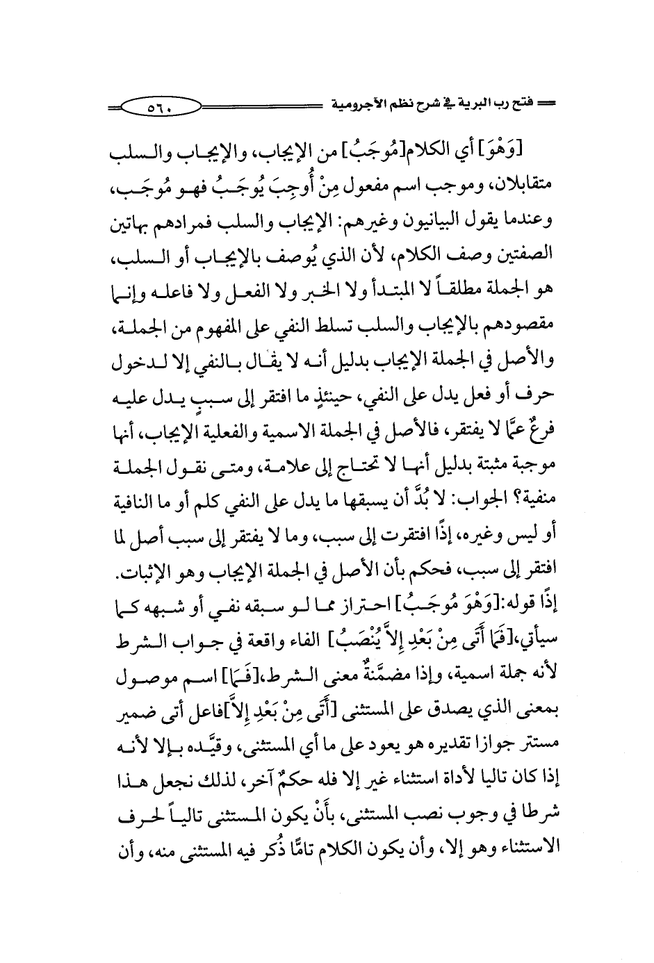 [وَهْوَ] أي الكلام [مُوجَبُ] من الإيجاب، والإيجاب والسلب متقابلان، وموجب اسم مفعول مِنْ أُوجِبَ يُوجَبُ فهو مُوجَب، وعندما يقول البيانيون وغيرهم: الإيجاب والسلب فمرادهم بهاتين الصفتين وصف الكلام، لأن الذي يُوصف بالإيجاب أو السلب، هو الجملة مطلقاً لا المبتدأ ولا الخبر ولا الفعل ولا فاعله وإنما مقصودهم بالإيجاب والسلب تسلط النفي على المفهوم من الجملة، والأصل في الجملة الإيجاب بدليل أنه لا يقال بالنفي إلا لدخول حرف أو فعل يدل على النفي، حينئذٍ ما افتقر إلى سببٍ يدل عليه فرعٌ عمَّا لا يفتقر، فالأصل في الجملة الاسمية والفعلية الإيجاب، أنها موجبة مثبتة بدليل أنها لا تحتاج إلى علامة، ومتى نقول الجملة منفية؟ الجواب: لا بُدَّ أن يسبقها ما يدل على النفي كلم أو ما النافية أو ليس وغيره، إذًا افتقرت إلى سبب، وما لا يفتقر إلى سبب أصل لما افتقر إلى سبب، فحكم بأن الأصل في الجملة الإيجاب وهو الإثبات. إذًا قوله: [وَهْوَ مُوجَبُ] احتراز مما لو سبقه نفي أو شبهه كما سيأتي، [فَمَا أَتَى مِنْ بَعْدِ إِلاَّ يُنْصَبُ] الفاء واقعة في جواب الشرط لأنه جملة اسمية، وإذا مضمَّنةٌ معنى الشرط، [فَمَا] ما اسم موصول بمعنى الذي يصدق على المستثنى [أَتَى مِنْ بَعْدِ إِلاَّ] فاعل أتى ضمير مستتر جوازا تقديره هو يعود على ما أي المستثنى، وقيَّده بإلا لأنه إذا كان تاليا لأداة استثناء غير إلا فله حكمٌ آخر، لذلك نجعل هذا شرطا في وجوب نصب المستثنى، أي يكون المستثنى تالياً لحرف الاستثناء وهو إلا، وأن يكون الكلام تامًّا ذُكر فيه المستثنى منه، وأن