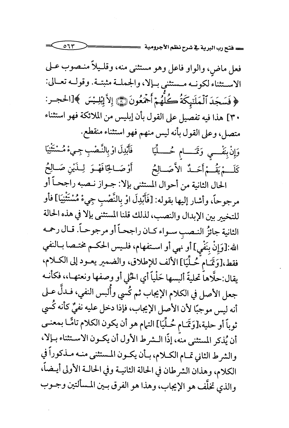 الحال الثانية من أحوال المستثنى بإلا: جواز نصبه راجحاً أو مرجوحاً، وأشار إليها بقوله: [فَأَبْدِلَ اوْ بِالنَّصْبِ جِيءْ مُسْتَثْنِيَا] فأو للتخيير بين الإبدال والنصب، لذلك قلنا المستثنى بإلا في هذه الحالة الثانية جائزُ النصبِ سواء كان راجحاً أو مرجوحاً. قال رحمه الله: [وَإِنْ بِنَفْيٍ] أو نهي أو استفهام، فليس الحكم مختصا بالنفي فقط، [وَتَمَامٍ حُلِّيَا] الألف للإطلاق، والضمير يعود إلى الكلام، يقال: حلَّاها تحليةً ألبسها حَلْياً أي الحُلي أو وصفها ونعتها،، فكأنه جعل الأصل في الكلام الإيجاب ثم كُسي وأُلبس النفي، فدلَّ على أنه ليس موجبًا لأن الأصل الإيجاب، فإذا دخل عليه نفيٌ كأنه كُسي ثوباً أو حلية، [وَتَمَامٍ حُلِّيَا] التمام هو أن يكون الكلام تاماًّ بمعنى أن يُذكر المستثنى منه، إذاً الشرط الأول أن يكون الاستثناء بإلا، والشرط الثاني تمام الكلام، أن يكون المستثنى منه مذكوراً في الكلام، وهذان الشرطان في الحالة الثانية وفي الحالة الأولى أيضاً، والذي تخلَّف هو الإيجاب، وهذا هو الفرق بين المسألتين وجوب