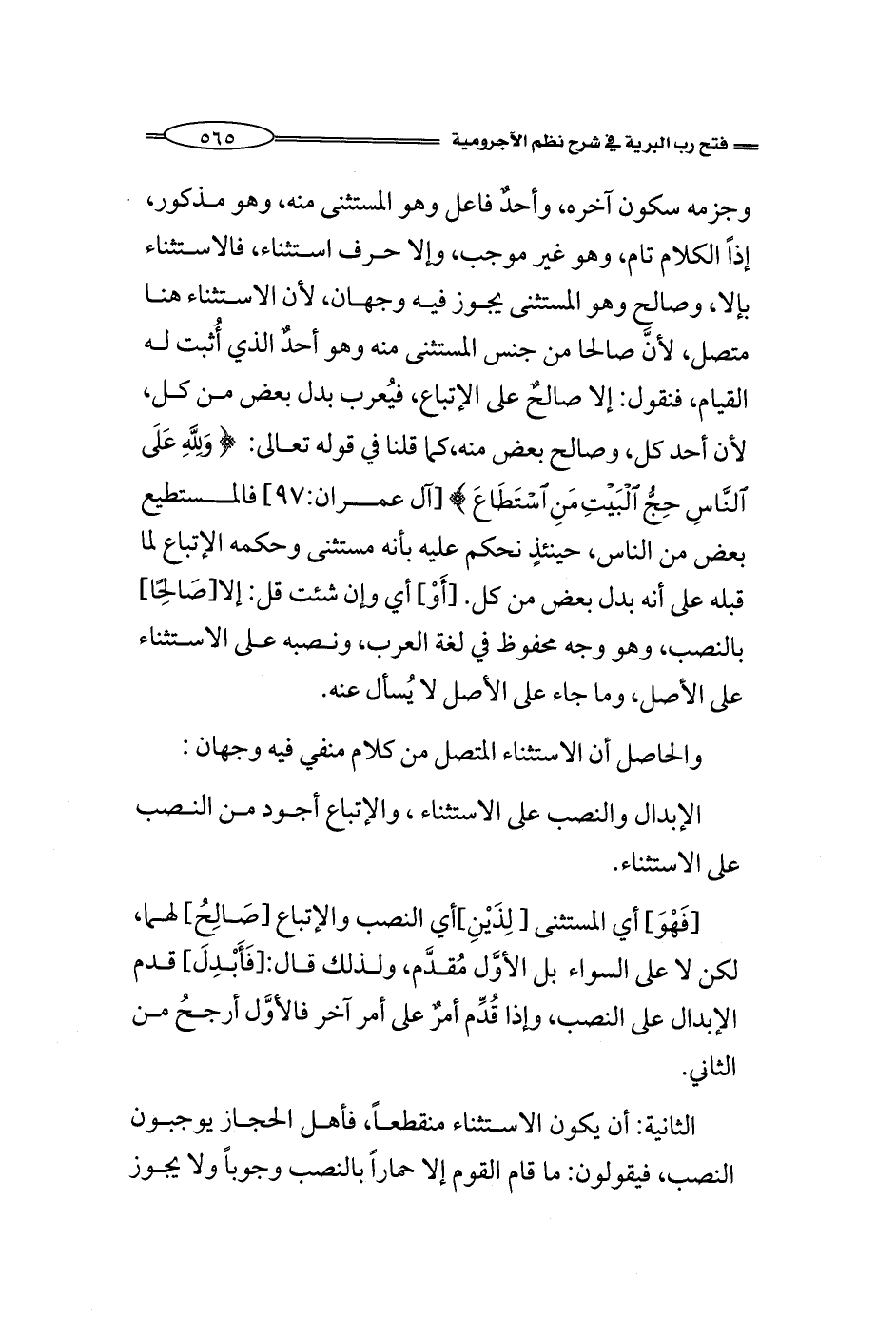وجزمه سكون آخره، وأحدٌ فاعل وهو المستثنى منه، وهو مذكور، إذاً الكلام تام، وهو غير موجب، وإلا حرف استثناء، فالاستثناء بإلا، وصالح وهو المستثنى يجوز فيه وجهان، لأن الاستثناء هنا متصل، لأنَّ صالحا من جنس المستثنى منه وهو أحدٌ الذي أُثبت له القيام، حينئذٍ نقول: إلا صالحٌ على الإتباع، فيُعرب بدل بعض من كل، لأن أحد كل، وصالح بعض منه، كما قلنا في قوله: (((((((عَلَى النَّاسِ حِجُّ الْبَيْتِ مَنِ اسْتَطَاعَ (97))) [آل عمران:97] فالمستطيع بعض من الناس، حينئذٍ نحكم عليه بأنه مستثنى وحكمه الإتباع أُتبع ما قبله على أنه بدل بعض من كل. [أَوْ] أي وإن شئت قل: إلا [صَالِحًا] بالنصب، وهو وجه محفوظ في لغة العرب، ونصبه على الاستثناء على الأصل، وما جاء على الأصل لا يُسأل عنه.