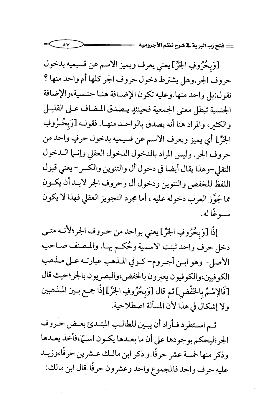 [وَبِحُرُوفِ الجَرِّ] يعني يعرف ويميز الاسم عن قسيميه بدخول حروف الجر. وهل يشترط دخول حروف الجر كلها أم واحد منها؟ نقول: بل واحد منها. وعليه تكون الإضافة هنا جنسية، والإضافة الجنسية تبطل معنى الجمعية فحينئذٍ يصدق المضاف على القليل والكثير، والمراد هنا أنه يصدق بالواحد منها. فقوله [وَبِحُرُوفِ الجَرِّ] أي يميز ويعرف الاسم عن قسيميه بدخول حرفٍ واحد من حروف الجر. وليس المراد بالدخول الدخول العقلي وإنما الدخول النقلي-وهذا يقال أيضا في دخول أل والتنوين والكسر- يعني قبول اللفظ للخفض والتنوين ودخول أل وحروف الجر لابد أن يكون مما جَوَّز العرب دخوله عليه، أما مجرد التجويز العقلي فهذا لا يكون مسوغًا له.