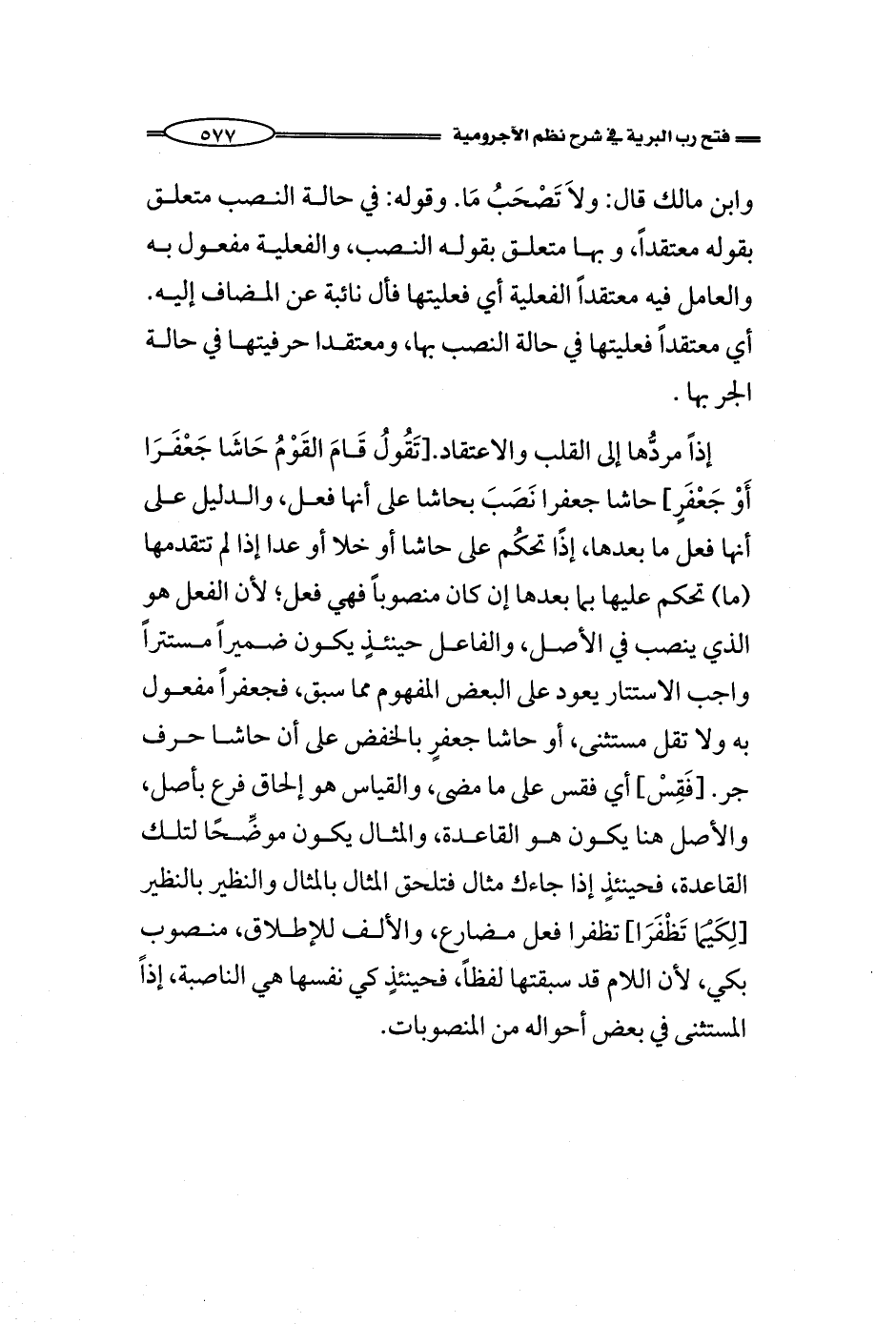 إذاً مردُّها إلى القلب والاعتقاد. [تَقُولُ قَامَ القَوْمُ حَاشَا جَعْفَرَا أَوْ جَعْفَرٍ] حاشا جعفرا نَصَبَ بحاشا على أنها فعل، والدليل على أنها فعل ما بعدها، إذًا تحكُم على حاشا أو خلا أو عدا إذا لم تتقدمها ما تحكم عليها بما بعدها إن كان منصوباً فهي فعل؛ لأن الفعل هو الذي ينصب في الأصل، والفاعل حينئذٍ يكون ضميراً مستتراً واجب الاستتار يعود على البعض المفهوم مما سبق، فجعفراً مفعول به ولا تقل مستثنى، أو حاشا جعفرٍ بالخفض على أن حاشا حرف جر. [فَقِسْ] أي فقس على ما مضى، والقياس هو إلحاق فرع بأصل، والأصل هنا يكون هو القاعدة، والمثال يكون موضِّحًا لتلك القاعدة، فحينئذٍ إذا جاءك مثال فتلحق المثال بالمثال والنظير بالنظير [لِكَيْمَا تَظْفَرَا] تظفرا فعل مضارع، والألف للإطلاق، منصوب بكي، لأن اللام قد سبقتها لفظاً، فحينئذٍ كي نفسها هي الناصبة، إذاً المستثنى في بعض أحواله من المنصوبات.