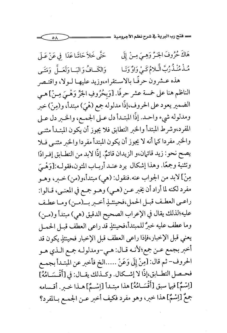 هذه عشرون حرفًا بالاستقراء، وزيد عليها لولا، واقتصر الناظم هنا على خمسة عشر حرفًا. [وَبِحُرُوفِ الجَرِّ وَهْيَ مِنْ] هي الضمير يعود على الحروف، إذًا مدلوله جمع (هْيَ) مبتدأ، و (مِنْ) خبر ومدلوله شيء واحد. إذًا المبتدأ دل على الجمع، والخبر دل على المفرد، وشرط المبتدأ والخبر التطابق فلا يجوز أن يكون المبتدأ مثنى والخبر مفردا كما أنه لا يجوز أن يكون المبتدأ مفردا والخبر مثنى فلا يصح نحو: زيد قائمان، والزيدان قائمٌ. إذًا لابد من التطابق إفرادًا وتثنية وجمعًا. وهذا إشكال يرد عند أرباب المتون، فقوله: [وَهْيَ مِنْ] لابد من الجواب عنه. فنقول: (هي) مبتدأ، و (من) خبر، وهو مفرد لكنه لما أراد أن يخبر عن (هي) وهو جمع في المعنى، قالوا: راعى العطف قبل الحمل، فحينئذٍ أخبر بـ (من) وما عطف عليه؛ لذلك يقال في الإعراب الصحيح الدقيق (هي) مبتدأ و (من) وما عطف عليه خبرٌ للمبتدأ، فحينئذٍ قد راعى العطف قبل الحمل يعني قبل الإخبار، فإذا راعى العطف قبل الإخبار فحينئذٍ يكون قد أخبر بجمع عن جمع؛ لأنه قال: هي-ومدلوله جمع الذي هو الحروف- ثم قال: [مِنْ إِلَى وَعَنْ ..... الخ فأخبر عن المبتدأ بجمع فحصل التطابق، إذًا لا إشكال. [وَبِحُرُوفِ الجَرِّ وَهْيَ مِنْ إِلَى] وكذلك يقال: في [أَقْسَامُهُ] [اِسْمٌ] فيما سبق [أَقْسَامُهُ] هذا مبتدأ [اِسْمٌ] هذا خبر. أقسامه جمعٌ [اِسْمٌ] هذا خبر، وهو مفرد فكيف أخبر عن الجمع بالمفرد؟