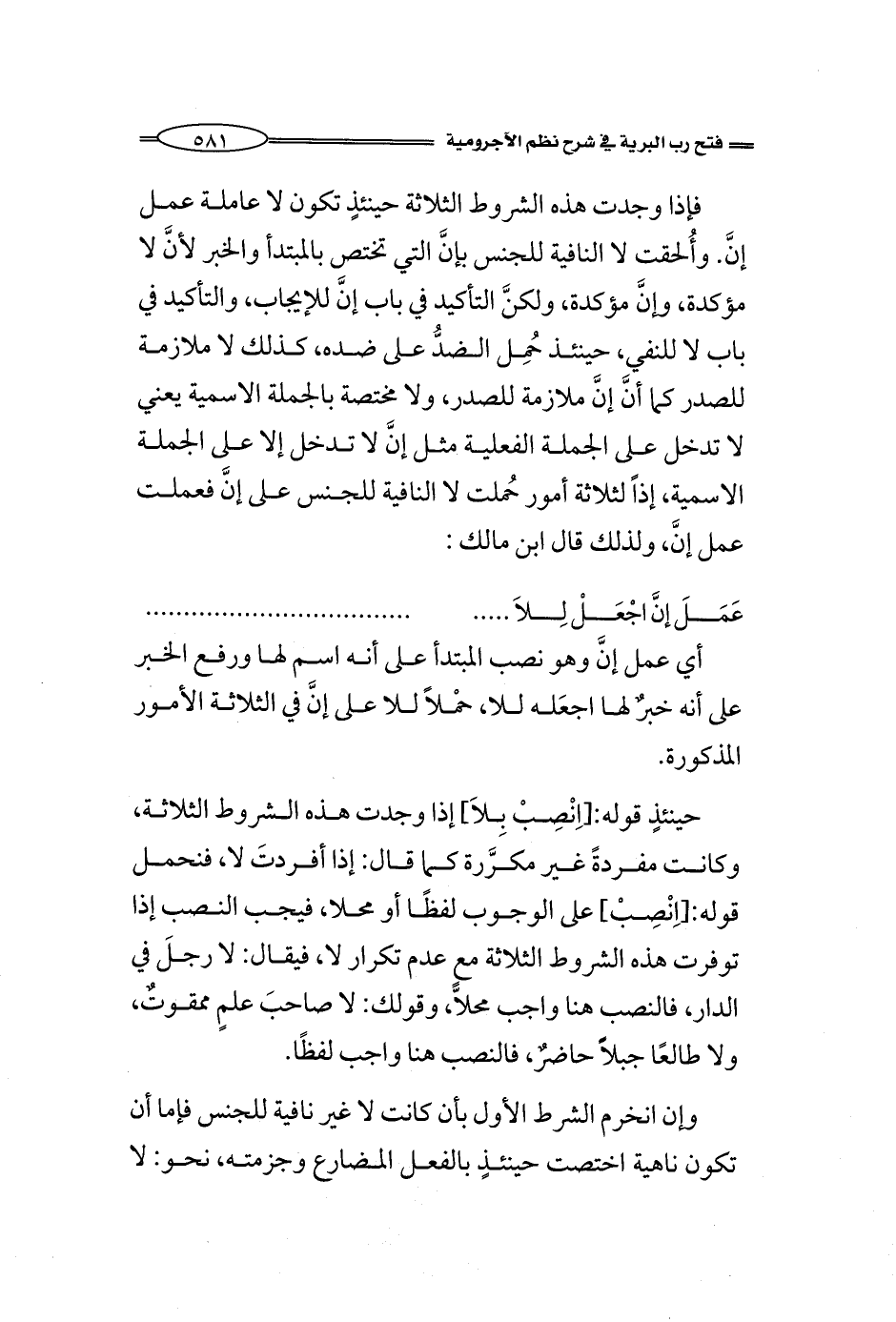 فإذا وجدت هذه الشروط الثلاثة حينئذٍ تكون لا عاملة عمل إنَّ، أُلحقت لا النافية للجنس بإنَّ التي تختص بالمبتدأ والخبر، قالوا: لأنَّ لا مؤكدة، وإنَّ مؤكدة، ولكنَّ التأكيد في باب إنَّ للإيجاب، والتأكيد في باب لا للنفي، حينئذ حُمِل الضدُّ على ضده، كذلك لا ملازمة للصدر كما أنَّ إنَّ ملازمة للصدر، ولا مختصة بالجملة الاسمية يعني لا تدخل على الجملة الفعلية مثل إنَّ لا تدخل إلا على الجملة الاسمية، إذاً لثلاثة أمور حُملت لا النافية للجنس على إنَّ فعملت عمل إنَّ، ولذلك قال ابن مالك: