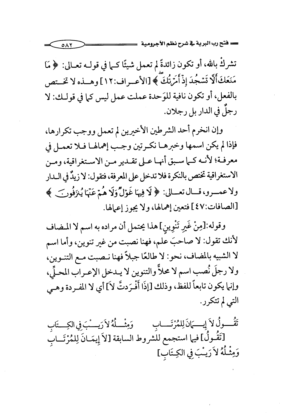 [تَقُولُ] فيما استجمع للشروط السابقة [لاَ إِيمَانَ لِلمُرْتَابِ وَمِثْلُهُ لاَ رَيْبَ فِي الكِتَابِ]