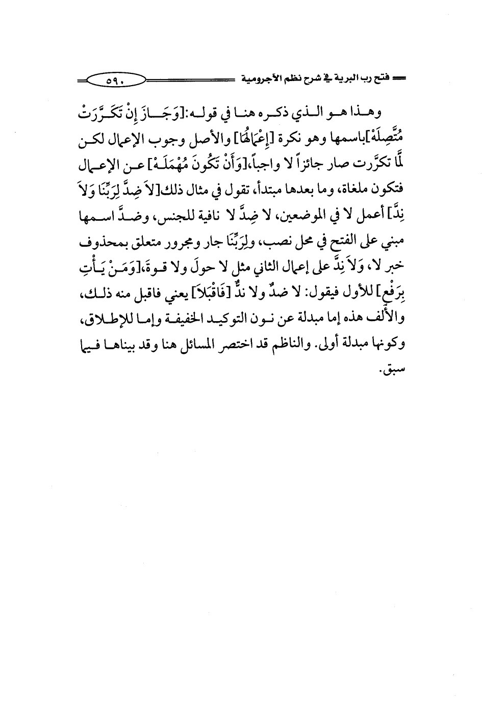 وهذا هو الذي ذكره هنا في قوله: [وَجَازَ إِنْ تَكَرَّرَتْ مُتَّصِلَهْ] باسمها وهو نكرة [إِعْمَالُهَا] والأصل وجوب الإعمال لكن لَمَّا تكرَّرت صار جائزاً لا واجباً، [وَأَنْ تَكُونَ مُهْمَلَهْ] عن الإعمال فتكون ملغاة، وما بعدها مبتدأ، تقول في مثال ذلك [لاَ ضِدَّ لِرَبِّنَا وَلاَ نِدَّ] أعمل لا في الموضعين، لا ضِدَّ لا نافية للجنس، وضدَّ اسمها مبني على الفتح في محل نصب، ولِرَبِّنَا جار ومجرور متعلق بمحذوف خبر لا، وَلاَ نِدَّ على إعمال الثاني مثل لا حولَ ولا قوةََ، [وَمَنْ يَأْتِ بِرَفْعٍ] للأول فيقول: لا ضدٌ ولا ندٌّ [فَاقْبَلاَ] يعني فاقبل منه ذلك، والألف هذه إما مبدلة عن نون التوكيد الخفيفة وإما للإطلاق، وكونها مبدلة أولى. والناظم قد اختصر المسائل هنا وقد بيناها فيما سبق.