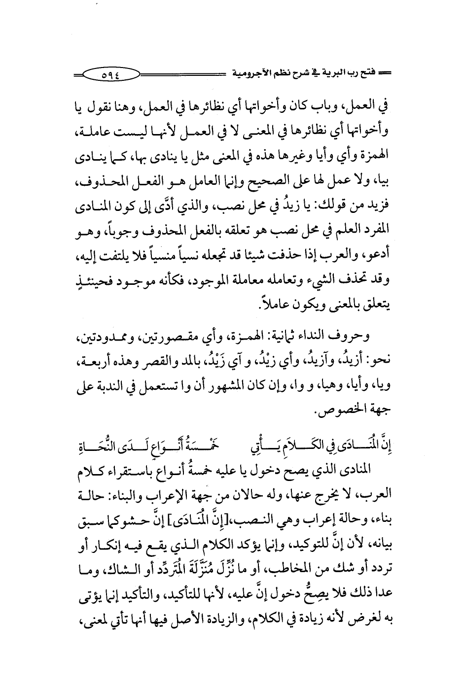 المنادى الذي يصح دخول يا عليه خمسةُ أنواع باستقراء كلام العرب، لا يخرج عنها، وله حالان من جهة الإعراب والبناء: حالة بناء، وحالة إعراب وهي النصب، [إِنَّ المُنَادَى] إنَّ حشوكما سبق بيانه، لأن إنَّ للتوكيد، وإنما يؤكد الكلام الذي يقع فيه إنكار أو تردد أو شك من المخاطب، أو ما نُزِّلَ مُنَزَّلَةَ المُتَردِّد أو الشاك، وما عدا ذلك فلا يصِحُّ دخول إنَّ عليه، لأنها للتأكيد، والتأكيد إنما يؤتى به لغرض لأنه زيادة في الكلام، والزيادة الأصل فيها أنها تأتي لمعنى،