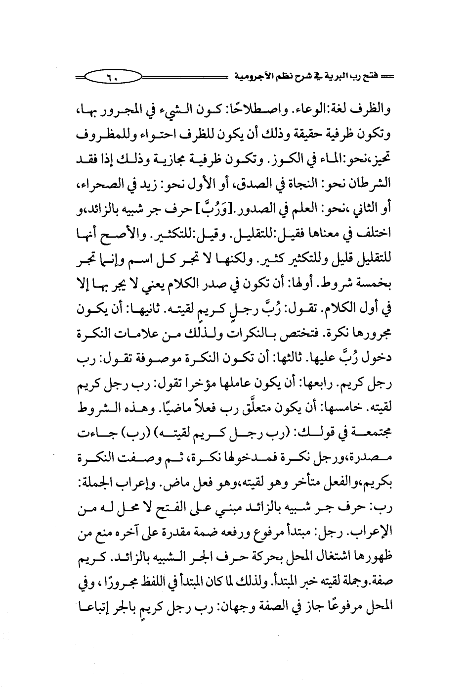 واصطلاحًا: كون الشيء في المجرور بها، وتكون ظرفية حقيقة وذلك أن يكون للظرف احتواء وللمظروف تحيز، نحو: الماء في الكوز. وتكون ظرفية مجازية وذلك إذا فقد الشرطان نحو: النجاة في الصدق، أو الأول نحو: زيد في الصحراء، أو الثاني، نحو: العلم في الصدور. [وَرُبَّ] حرف جر شبيه بالزائد، واختلف في معناها فقيل: للتقليل. وقيل: للتكثير. والأصح أنها للتقليل قليل وللتكثير كثير. ولكنها لا تجر كل اسم وإنما تجر بخمسة شروط. أولها: أن تكون في صدر الكلام يعني لا يجر بها إلا في أول الكلام. تقول: رُبَّ رجلٍ كريمٍ لقيته. ثانيها: أن يكون مجرورها نكرة. فتختص بالنكرات ولذلك من علامات النكرة دخول رُبَّ عليها. ثالثها: أن تكون النكرة موصوفة تقول: رب رجل كريم. رابعها: أن يكون عاملها مؤخرا رب رجل كريم لقيته. خامسها: أن يكون متعلَّق رب فعلاً ماضيًا. وهذه الشروط مجتمعة في قولك: (رب رجل كريم لقيته) (رب) جاءت مصدرة، ورجل نكرة فمدخولها نكرة، ثم وصفت النكرة بكريم، والفعل متأخر وهو لقيته، وهو فعل ماض. وإعراب الجملة: رب: حرف جر شبيه بالزائد مبني على الفتح لا محل له من الإعراب. رجل: مبتدأ مرفوع ورفعه ضمة مقدرة على آخره منع من ظهورها اشتغال المحل بحركة حرف الجر الشبيه بالزائد. كريم صفة. وجملة لقيته خبر المبتدأ. ولذلك لما كان المبتدأ في اللفظ مجرورًا، وفي المحل مرفوعًا جاز في الصفة وجهان: رب رجل كريمٍ بالجر إتباعا