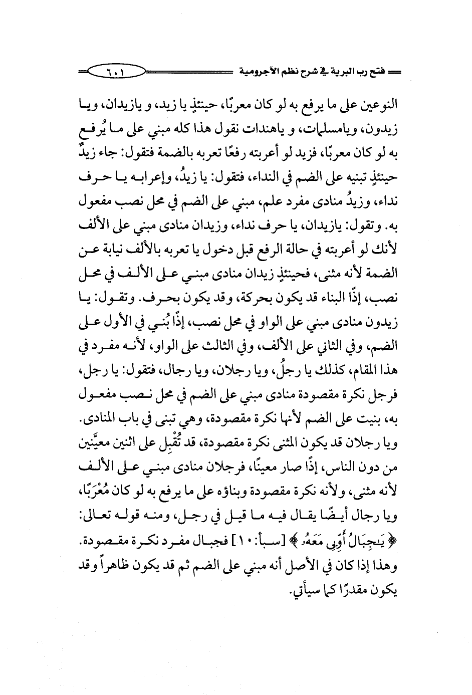 النوعين على ما يرفع به لو كان معربًا، حينئذٍ يا زيد، ويازيدان، ويا زيدون، ويامسلمات، وياهندات نقول هذا كله مبني على ما يُرفع به لو كان معربًا، فزيد لو أعربته رفعًا تعربه بالضمة فتقول: جاء زيدٌ حينئذٍ تبنيه على الضم في النداء، فتقول: يا زيدُ، وإعرابه يا حرف نداء، وزيدُ منادى مفرد علم، مبني على الضم في محل نصب مفعول به. وتقول: يازيدان، يا حرف نداء، وزيدان منادى مبني على الألف لأنك لو أعربته في حالة الرفع قبل دخول يا قبل البناء تعربه بالألف نيابة عن الضمة لأنه مثنى، فحينئذٍ زيدان منادى مبني على الألف في محل نصب، إذًا البناء قد يكون بحركة، وقد يكون بحرف. وتقول: يا زيدون منادى مبني على الواو في محل نصب، إذًا بُني في الأول على الضم، وفي الثاني على الألف، وفي الثالث على الواو، لأنه مفرد في هذا المقام، كذلك يا رجلُ، ويا رجلان، ويا رجال، فتقول: يا رجل، فرجل نكرة مقصودة منادى مبني على الضم في محل نصب مفعول به، بنيت على الضم لأنها نكرة مقصودة، وهي تبنى في باب المنادى. ويا رجلان قد يكون المثنى نكرة مقصودة، قد تُقْبِل على اثنين معيَّنين من دون الناس، إذًا صار معينًا، فرجلان منادى مبني على الألف لأنه مثنى، ولأنه نكرة مقصودة وبناؤه على ما يرفع به لو كان مُعْرَبًا، ويا رجال أيضًا يقال فيه ما قيل في رجل، ومنه قوله: ((يَا جِبَالُأَوِّبِي مَعَهُ (10))) [سبأ:10] فجبال مفرد نكرة مقصودة. فهذا إذا كان في الأصل أنه مبني على الضم ثم قد يكون ظاهراً وقد يكون مقدرًا كما سيأتي.