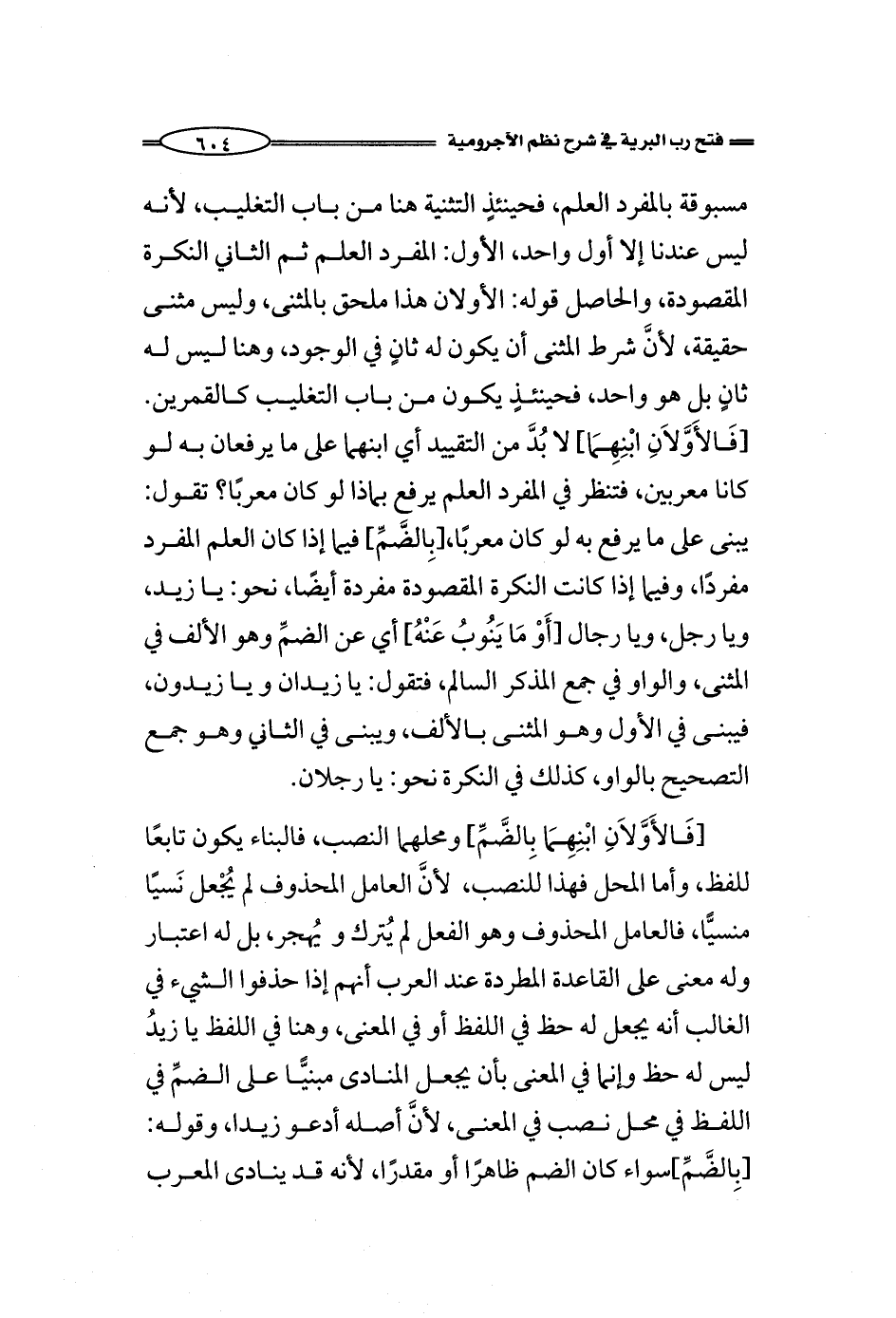 مسبوقة بالمفرد العلم، فحينئذٍ التثنية هنا من باب التغليب، لأنه ليس عندنا إلا أول واحد، الأول: المفرد العلم ثم الثاني النكرة المقصودة، والحاصل قوله: الأولان هذا ملحق بالمثنى، وليس مثنى حقيقة، لأنَّ شرط المثنى أن يكون له ثانٍ في الوجود، وهنا ليس له ثانٍ بل هو واحد، حينئذٍ يكون من باب التغليب كالقمرين. [فَالأَوَّلاَنِ ابْنِهِمَا] لا بُدَّ من التقييد أي ابنهما على ما يرفعان به لو كانا معربين، فتنظر في المفرد العلم يرفع بماذا لو كان معربًا؟ تقول: يبنى على ما يرفع به لو كان معربًا، [بِالضَّمِّ] فيما إذا كان العلم المفرد مفردًا، وفيما إذا كانت النكرة المقصودة مفردة أيضًا، نحو: يا زيد، ويا رجل، [أَوْ مَا يَنُوبُ عَنْهُ] أي عن الضمِّ وهو الألف في المثنى، والواو في جمع المذكر السالم، فتقول: يا زيدان ويا زيدون، فيبنى في الأول المثنى بالألف، ويبنى في الثاني جمع التصحيح بالواو، كذلك في النكرة يا رجلُ، ويا رجلان، ويا رجال.