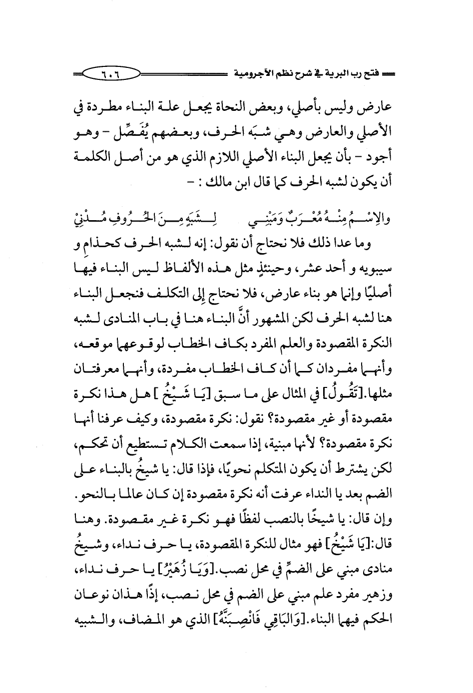 وما عدا ذلك فلا نحتاج أن نقول: إنه لشبه الحرف كحذامِ وسيبويه وأحد عشر، حينئذٍ مثل هذه الألفاظ ليس البناء فيها أصليًا وإنما هو بناء عارض، فلا نحتاج التكلف فنجعل البناء هنا لشبه الحرف لكن المشهور البناء هنا في باب المنادى لشبه النكرة المقصودة والعلم المفرد بكاف الخطاب لوقوعهما موقعه، وأنهما مفردان كما أن كاف الخطاب مفردة، وأنهما معرفتان مثلها. [تَقُولُ] في المثال على ما سبق [يَا شَيْخُ] هل هذا نكرة مقصودة أو غير مقصودة؟ نقول: نكرة مقصودة، وكيف عرفنا أنها نكرة مقصودة؟ لأنها مبنية، إذا سمعت الكلام تستطيع أن تحكم، لكن يشترط أن يكون المتكلم نحويًا، فإذا قال: يا شيخُ بالبناء على الضم بعد يا النداء عرفت أنه نكرة مقصودة إن كان عالما بالنحو. وإن قال: يا شيخًا بالنصب لفظًا فهو نكرة غير مقصودة. وهنا قال: [يَا شَيْخُ] فهو مثال للنكرة المقصودة، يا حرف نداء، وشيخُ منادى مبني على الضمِّ في محل نصب. [وَيَا زُهَيْرُ] يا حرف نداء، وزهير مفرد علم مبني على الضم في محل نصب، إذًا هذان نوعان الحكم فيهما البناء. [وَالبَاقِي فَانْصِبَنَّهُ] الذي هو المضاف، والشبيه