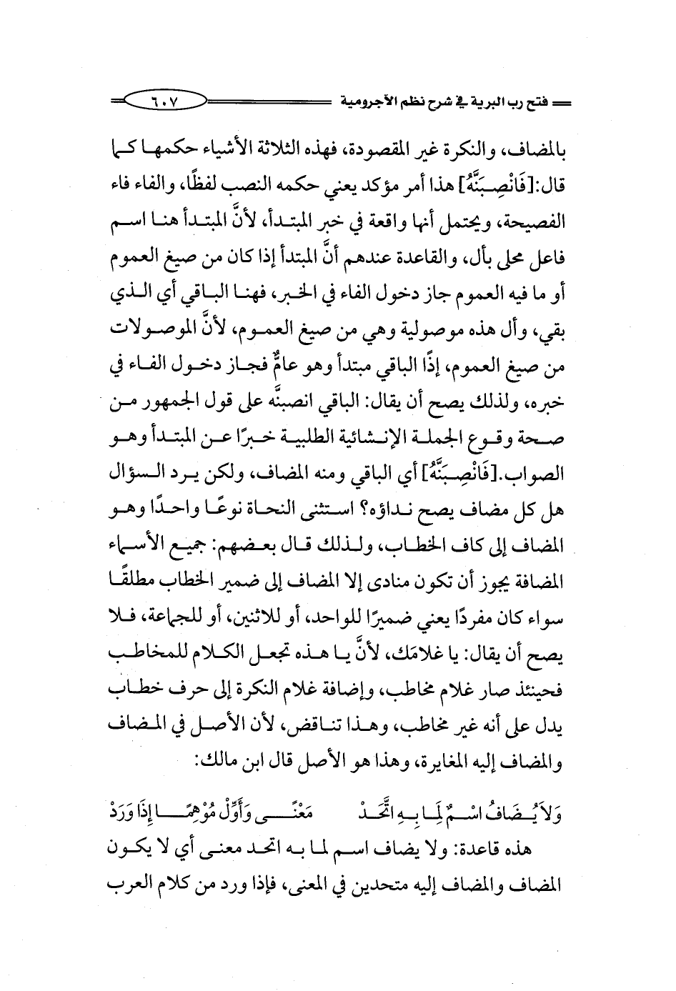 بالمضاف، والنكرة غير المقصودة، فهذه الثلاثة الأشياء حكمها كما قال: [فَانْصِبَنَّهُ] هذا أمر مؤكد يعني حكمه النصب لفظًا، والفاء فاء الفصيحة، ويحتمل أنها واقعة في خبر المبتدأ، لأنَّ المبتدأ هنا اسم فاعل محلى بأل، والقاعدة عندهم أنَّ المبتدأ إذا كان من صيغ العموم أو ما فيه العموم جاز دخول الفاء في الخبر، فهنا الباقي أي الذي بقي، وأل هذه موصولية وهي من صيغ العموم، لأنَّ الموصولات من صيغ العموم، إذًا الباقي مبتدأ وهو عامٌّ فجاز دخول الفاء في خبره، ولذلك يصح أن يقال: الباقي انصبنَّه على قول الجمهور من صحة وقوع الجملة الإنشائية الطلبية خبرًا عن المبتدأ وهو الصواب. [فَانْصِبَنَّهُ] أي الباقي ومنه المضاف، ولكن يرد السؤال هل كل مضاف يصح نداؤه؟ استثنى النحاة نوعًا واحدًا وهو المضاف إلى كاف الخطاب، ولذلك قال بعضهم: جميع الأسماء المضافة يجوز أن تكون منادى إلا المضاف إلى ضمير الخطاب مطلقًا سواء كان مفردًا يعني ضميرًا للواحد، أو للاثنين، أو للجماعة، فلا يصح أن يقال: يا غلامَك، لأنَّ يا هذه تجعل الكلام للمخاطب فحينئذ صار غلام مخاطب، وإضافة غلام النكرة إلى حرف خطاب يدل على أنه غير مخاطب، وهذا تناقض، لأن الأصل في المضاف والمضاف إليه المغايرة، وهذا هو الأصل قال ابن مالك: