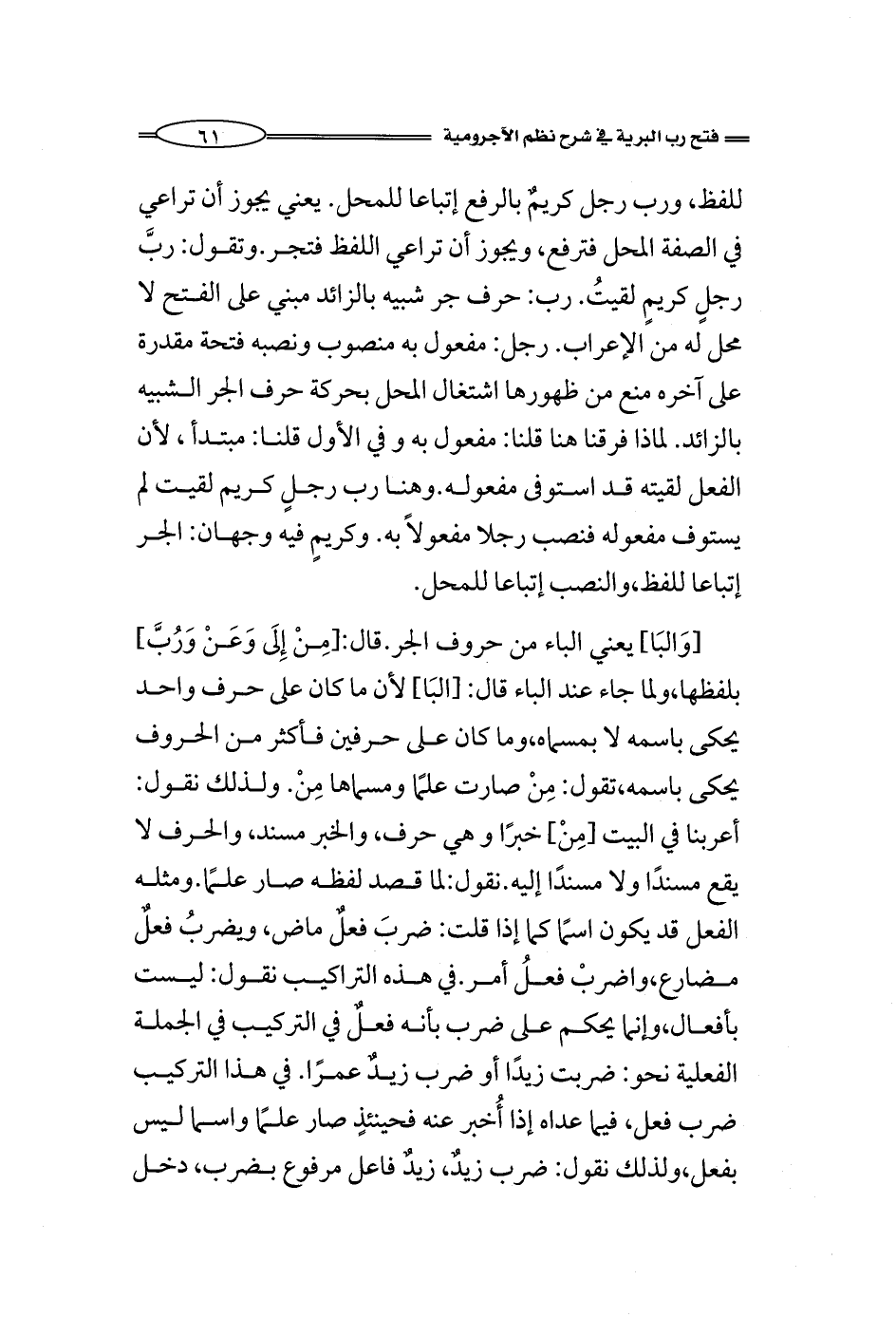 للفظ، ورب رجل كريمٌ بالرفع إتباعا للمحل. يعني يجوز أن تراعي في الصفة المحل فترفع، ويجوز أن تراعي اللفظ فتجر. وتقول: ربَّ رجلٍ كريمٍ لقيتُ. رب: حرف جر شبيه بالزائد مبني على الفتح لا محل له من الإعراب. رجل: مفعول به منصوب ونصبه فتحة مقدرة على آخره منع من ظهورها اشتغال المحل بحركة حرف الجر الشبيه بالزائد. لماذا فرقنا هنا قلنا: مفعول به وفي الأول قلنا: مبتدأ، لأن الفعل لقيته قد استوفى مفعوله. وهنا رب رجلٍ كريم لقيت لم يستوف مفعوله فنصب رجلا مفعولاً به. وكريمٍ فيه وجهان: الجر إتباعا للفظ، والنصب إتباعا للمحل.